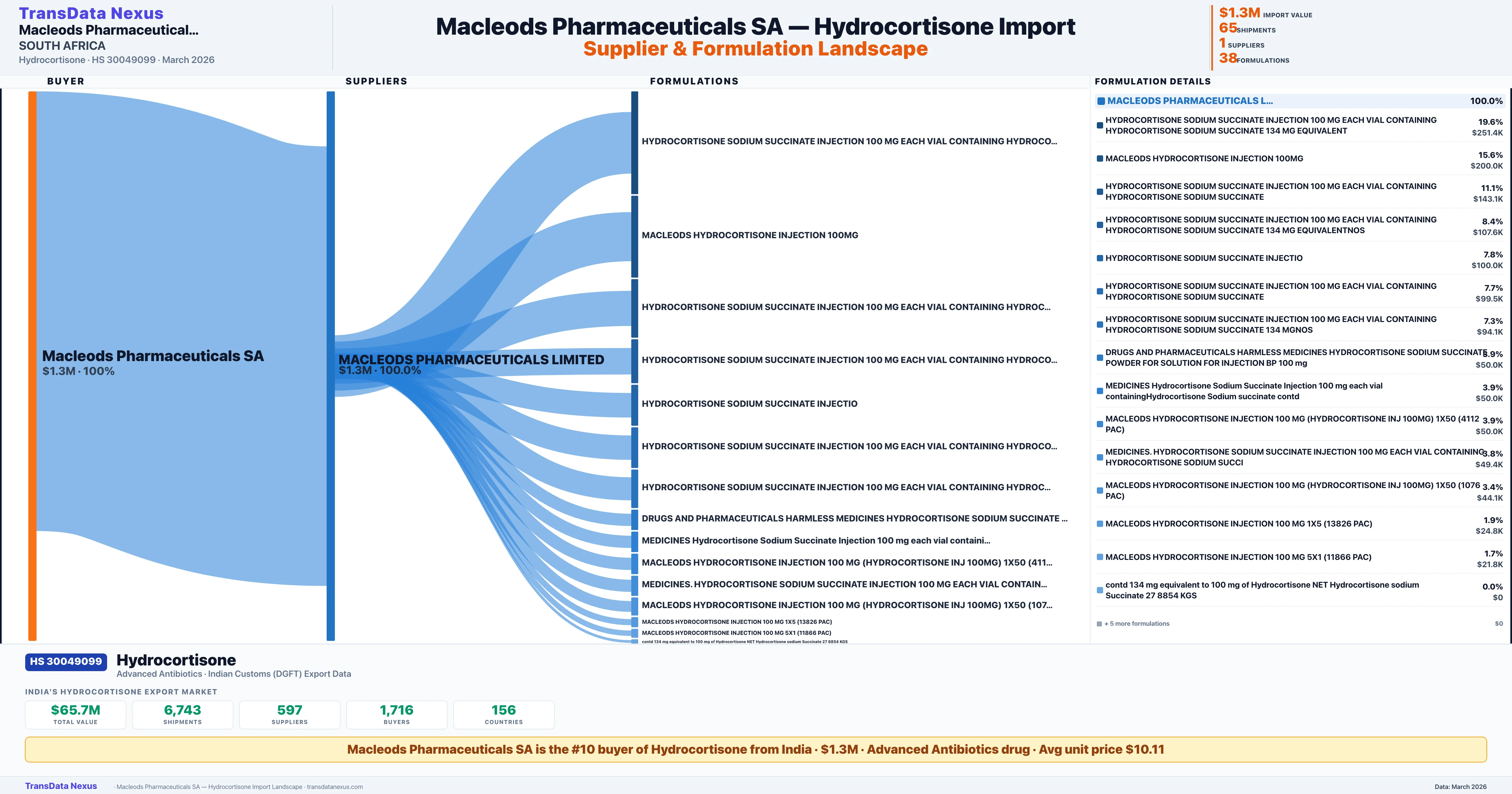 MACLEODS PHARMACEUTICALS SA sources Hydrocortisone from 1 verified Indian supplier: MACLEODS PHARMACEUTICALS LIMITED ($1.3M, 100.0%). This is based on 65 customs records.