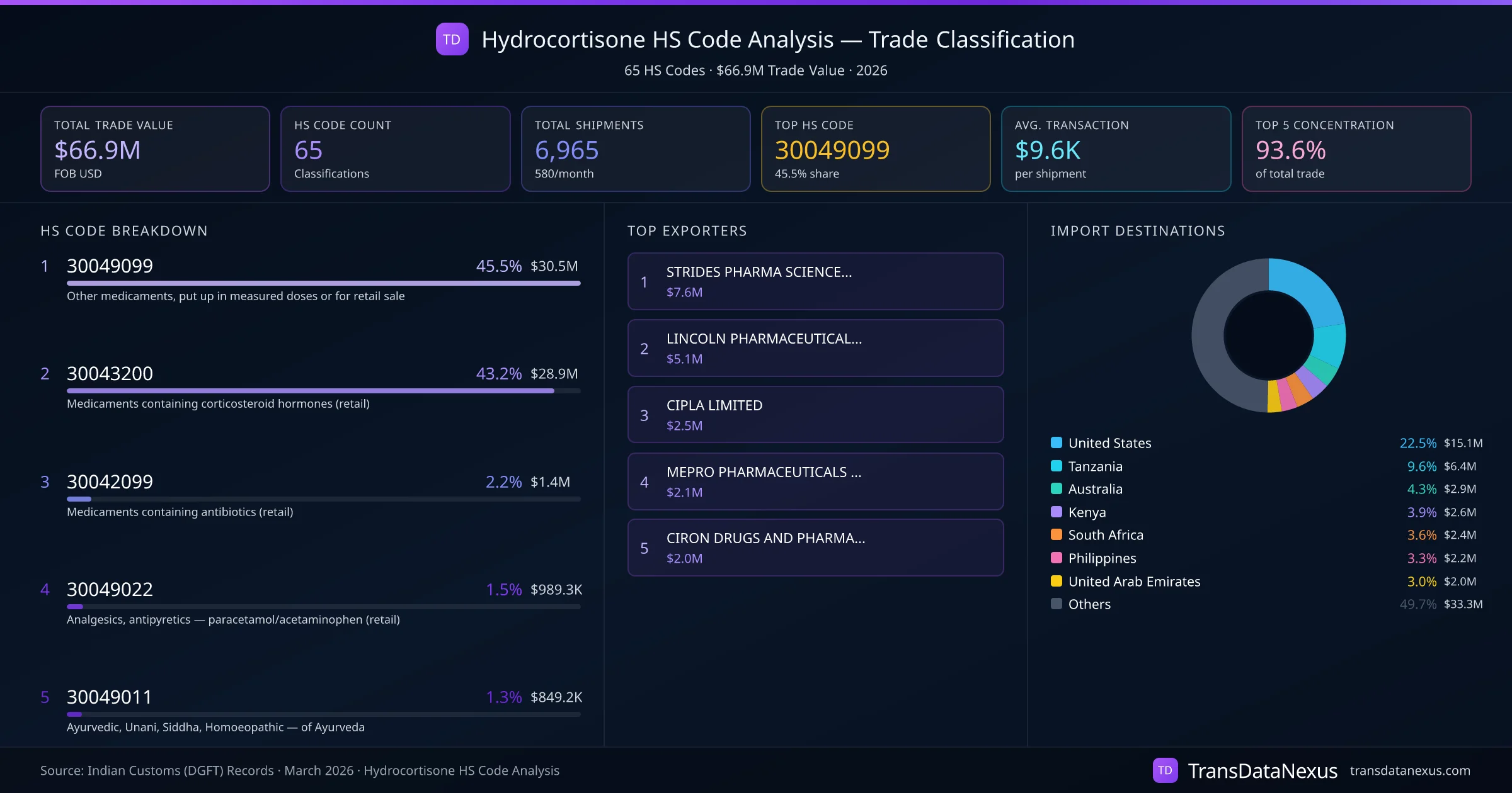 India exports Hydrocortisone under 65 distinct HS code classifications, representing a total trade value of $66.9M across 6,965 shipments. The dominant classification is HS 30049099 (Other medicaments, put up in measured doses or for retail sale), accounting for 45.5% of all Hydrocortisone trade at $30.5M. HS 30043200 (Medicaments containing corticosteroid hormones (retail)) follows at 43.2% ($28.9M). The top 5 HS codes together account for 93.6% of total Hydrocortisone trade from India. The average transaction value is $9611. Key importing markets include United States, Tanzania, Australia. Leading exporters include STRIDES PHARMA SCIENCE LIMITED and LINCOLN PHARMACEUTICALS LTD. Data sourced from Indian Customs (DGFT) shipping bill records.