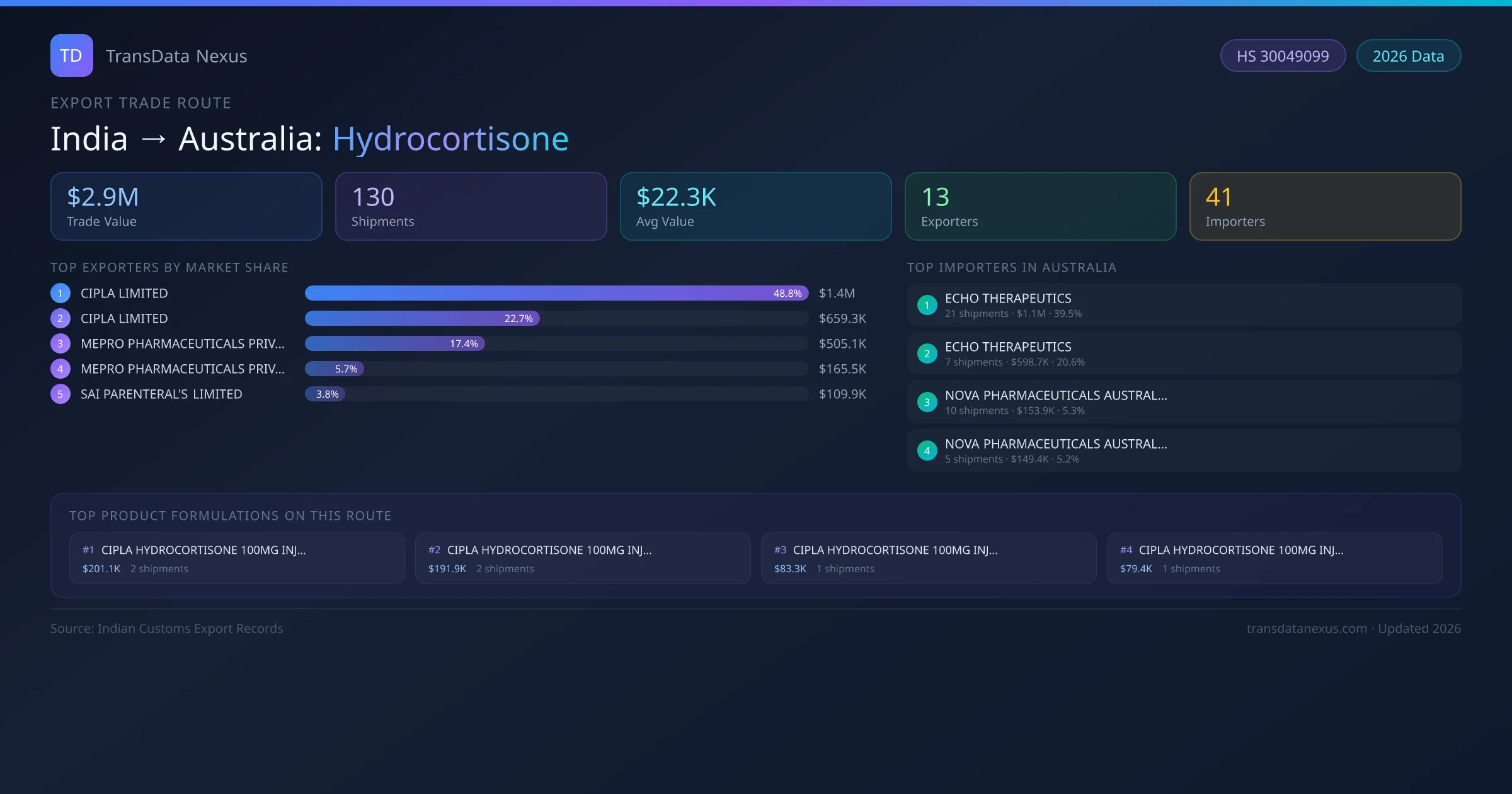 India exports Hydrocortisone to Australia worth approximately $2.9M USD across 130 recorded shipments. The average value per shipment is $22.3K USD.