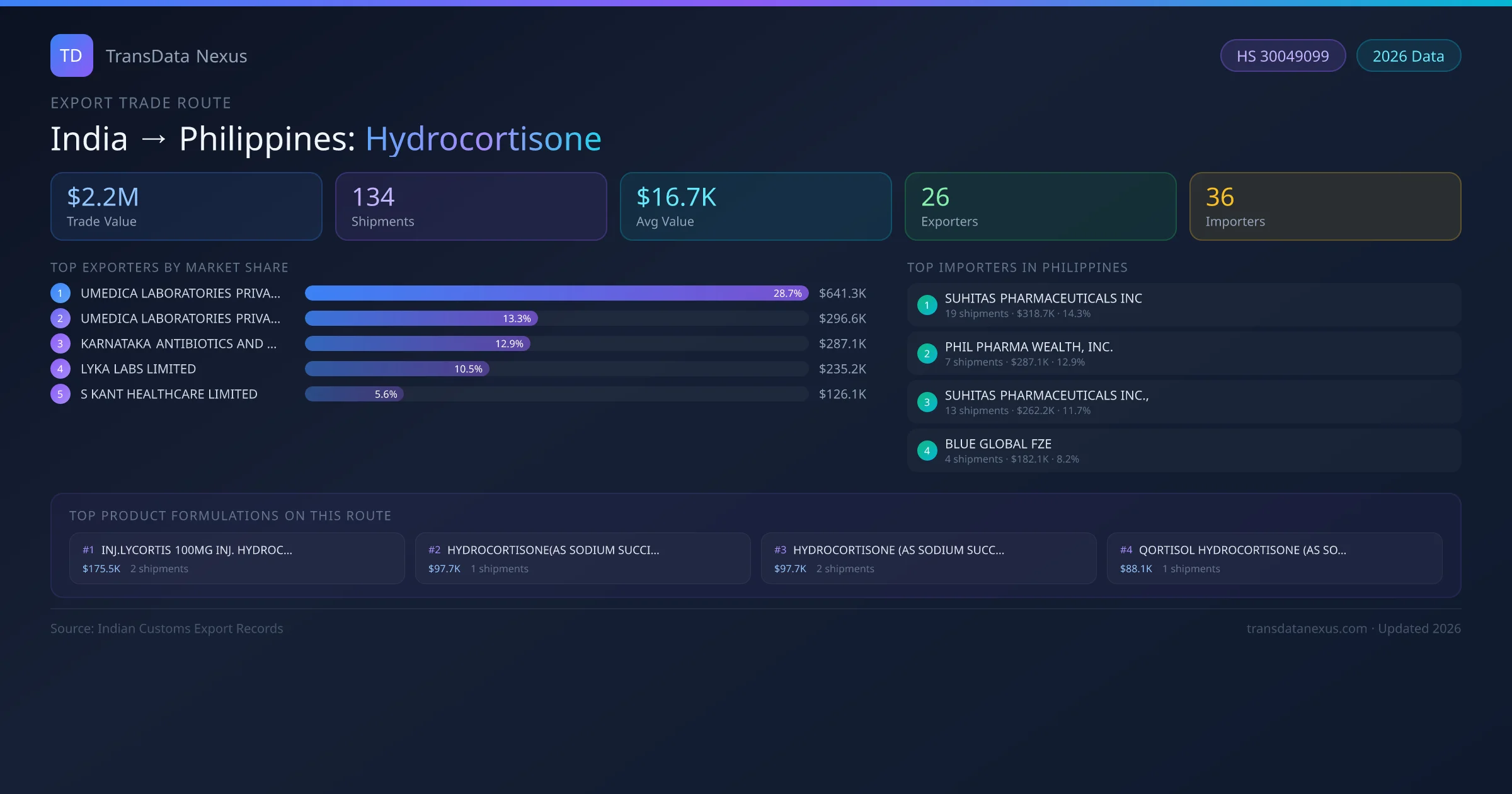 - 1.Route Identification: India to Philippines export trade corridor identified from Indian Customs (DGFT) records for Hydrocortisone.