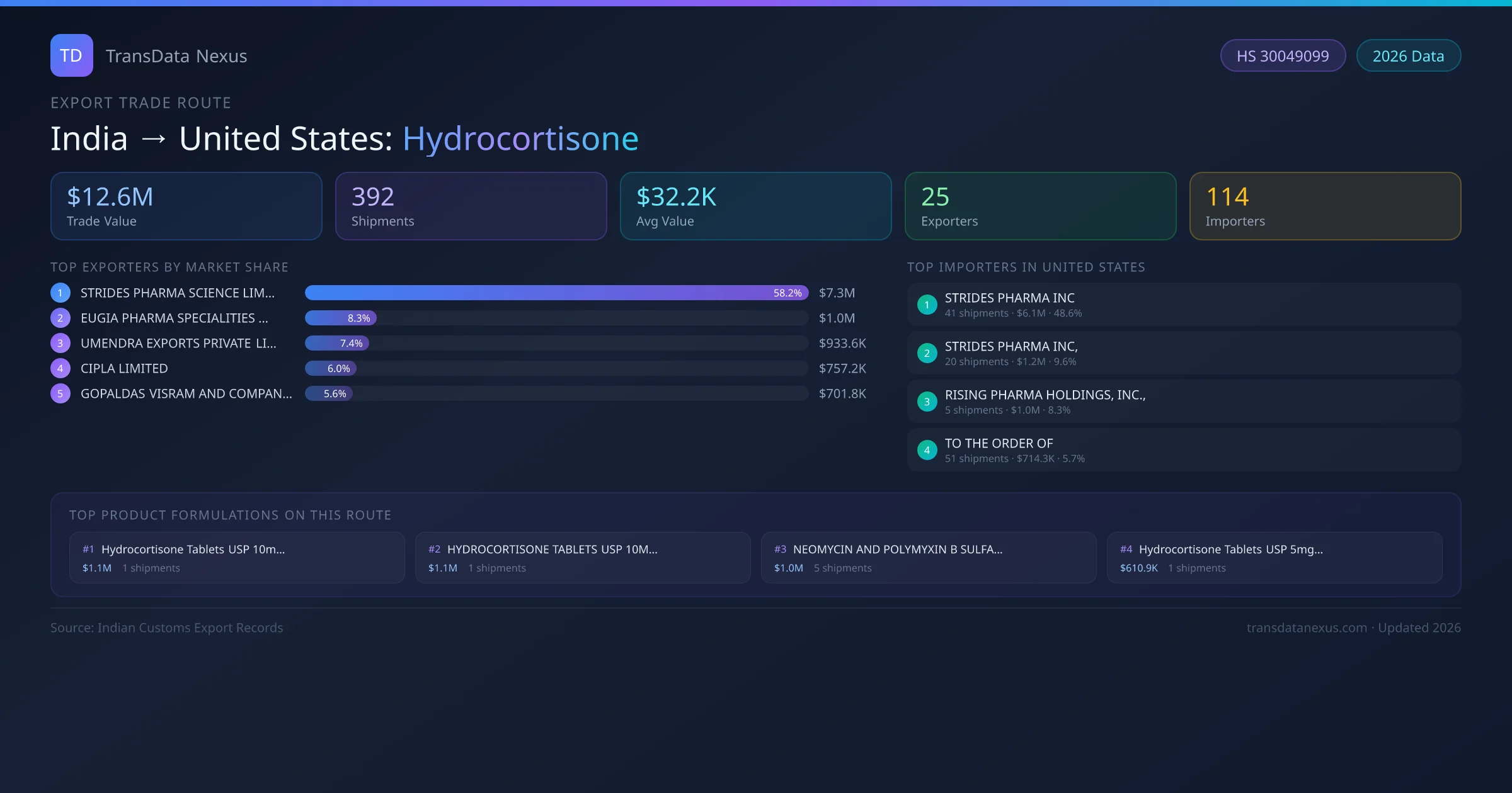 India has recorded 392 verified shipments of Hydrocortisone exported to United States, representing a combined trade value of $12.6M USD. This corridor is served by 25 active Indian exporters, with an average shipment value of $32.2K USD. The leading Indian exporter is STRIDES PHARMA SCIENCE LIMITED, which accounts for 58% of total export value with 61 shipments worth $7.3M USD. On the buying side, STRIDES PHARMA INC is the largest importer in United States with $6.1M USD in purchases. The top 3 suppliers — STRIDES PHARMA SCIENCE LIMITED, EUGIA PHARMA SPECIALITIES LIMITED, UMENDRA EXPORTS PRIVATE LIMITED — together control 74% of total trade value on this route. All data sourced from Indian Customs (DGFT) shipping bill records. Values reported in FOB USD.