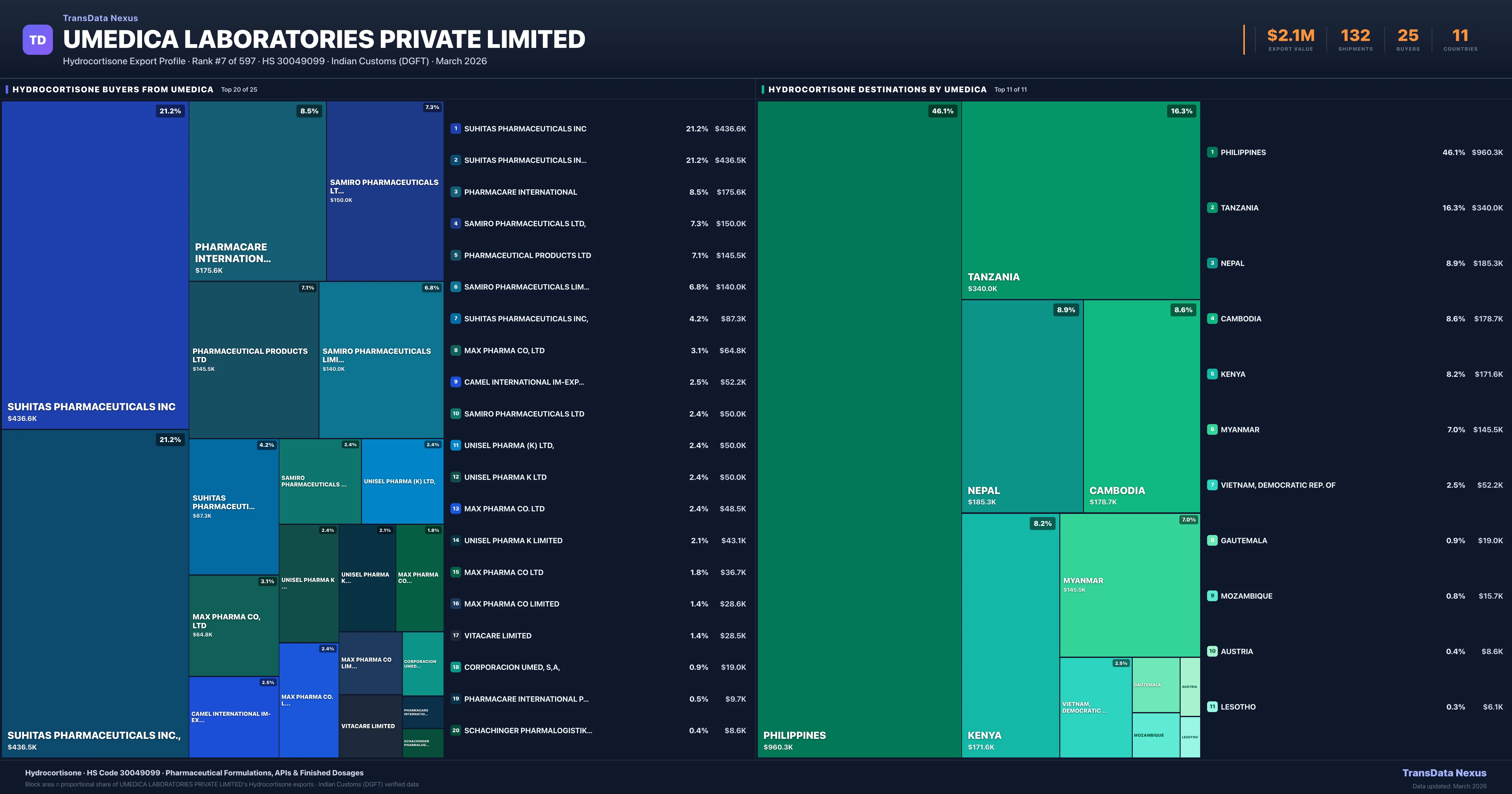 Umedica Laboratories Private Limited supplies Hydrocortisone to 25 buyers globally. The largest buyer is SUHITAS PHARMACEUTICALS INC (PHILIPPINES), followed by SUHITAS PHARMACEUTICALS INC., (PHILIPPINES) and PHARMACARE INTERNATIONAL (NEPAL). These buyers represent pharmaceutical distributors, hospital groups, and government procurement agencies in their respective markets.