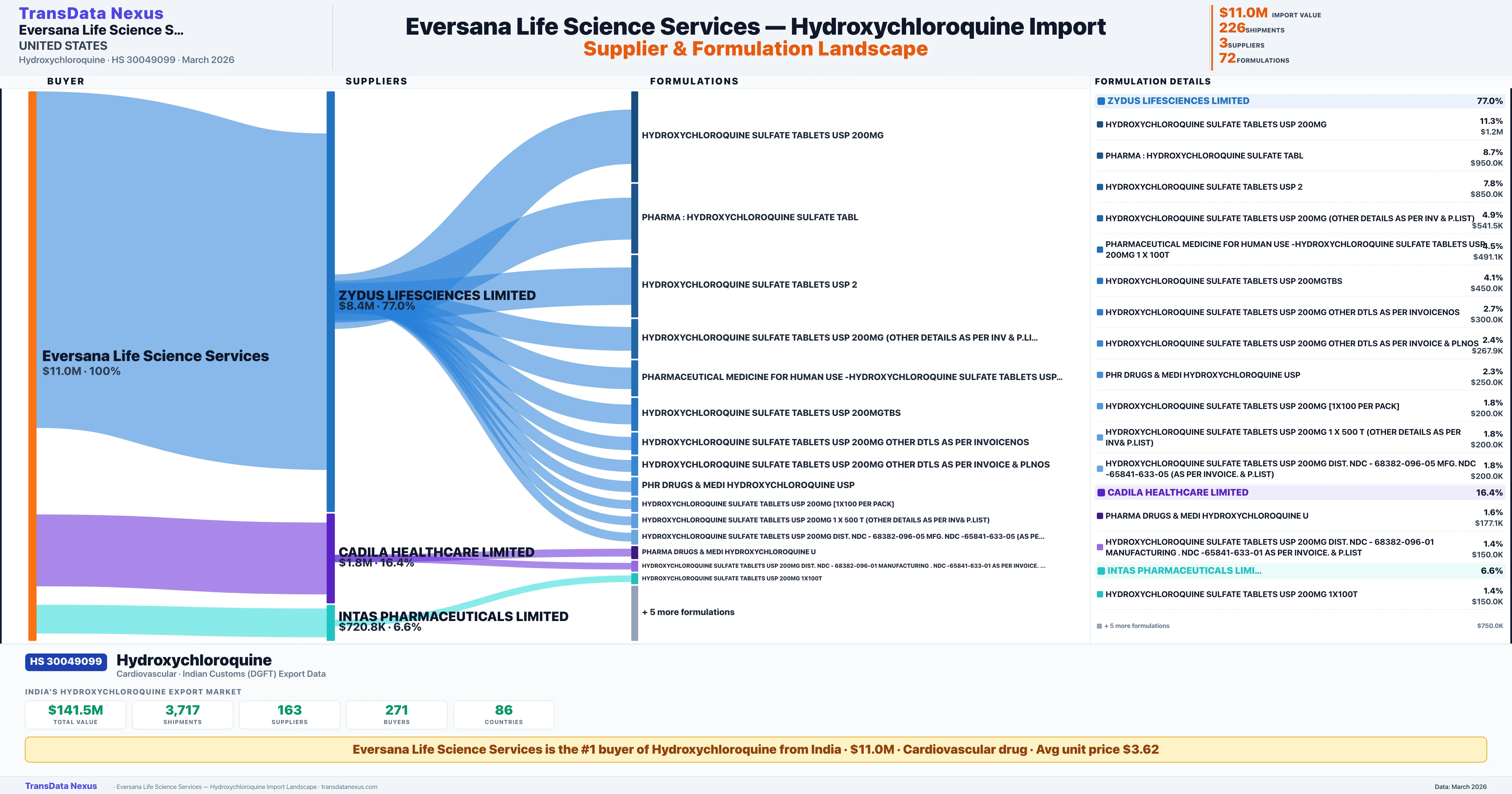 EVERSANA LIFE SCIENCE SERVICES sources Hydroxychloroquine from 3 verified Indian suppliers: ZYDUS LIFESCIENCES LIMITED ($8.4M, 77.0%), CADILA HEALTHCARE LIMITED ($1.8M, 16.4%), INTAS PHARMACEUTICALS LIMITED ($720.8K, 6.6%). This is based on 226 customs records.