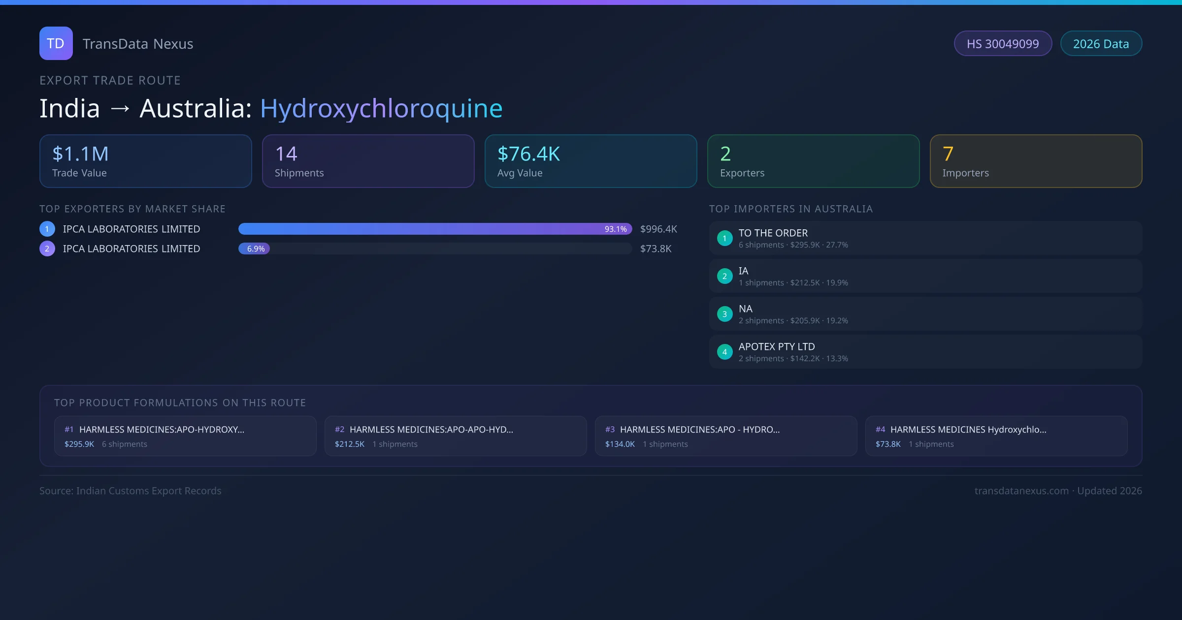 India has recorded 14 verified shipments of Hydroxychloroquine exported to Australia, representing a combined trade value of $1.1M USD. This corridor is served by 2 active Indian exporters, with an average shipment value of $76.4K USD. The leading Indian exporter is IPCA LABORATORIES LIMITED, which accounts for 93% of total export value with 13 shipments worth $996.4K USD. On the buying side, TO THE ORDER is the largest importer in Australia with $295.9K USD in purchases. All data sourced from Indian Customs (DGFT) shipping bill records. Values reported in FOB USD.