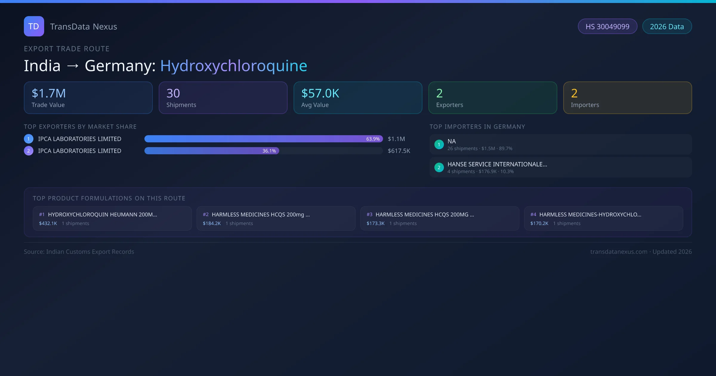 - 1.Route Identification: India to Germany export trade corridor identified from Indian Customs (DGFT) records for Hydroxychloroquine.