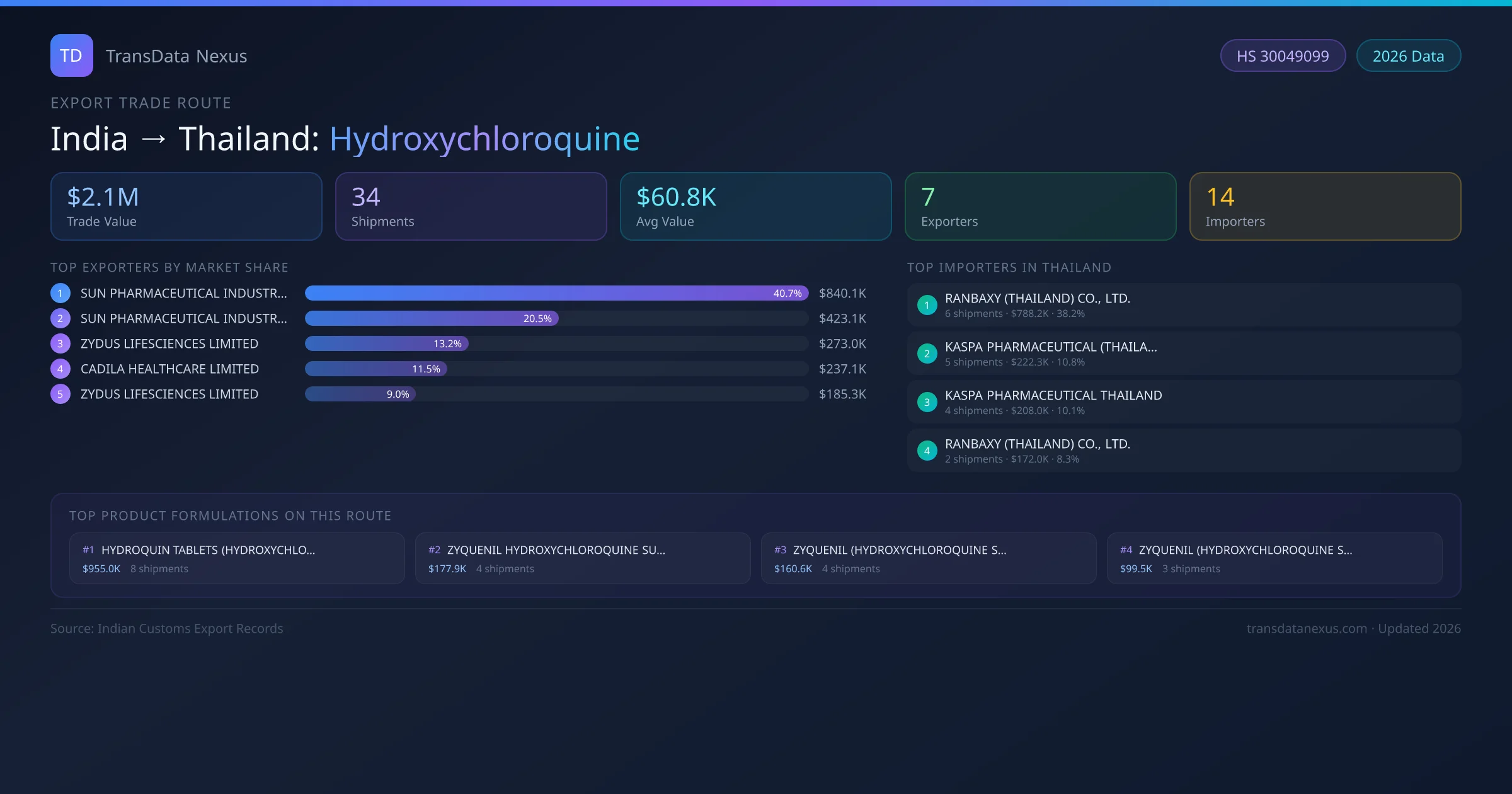 - 1.Route Identification: India to Thailand export trade corridor identified from Indian Customs (DGFT) records for Hydroxychloroquine.