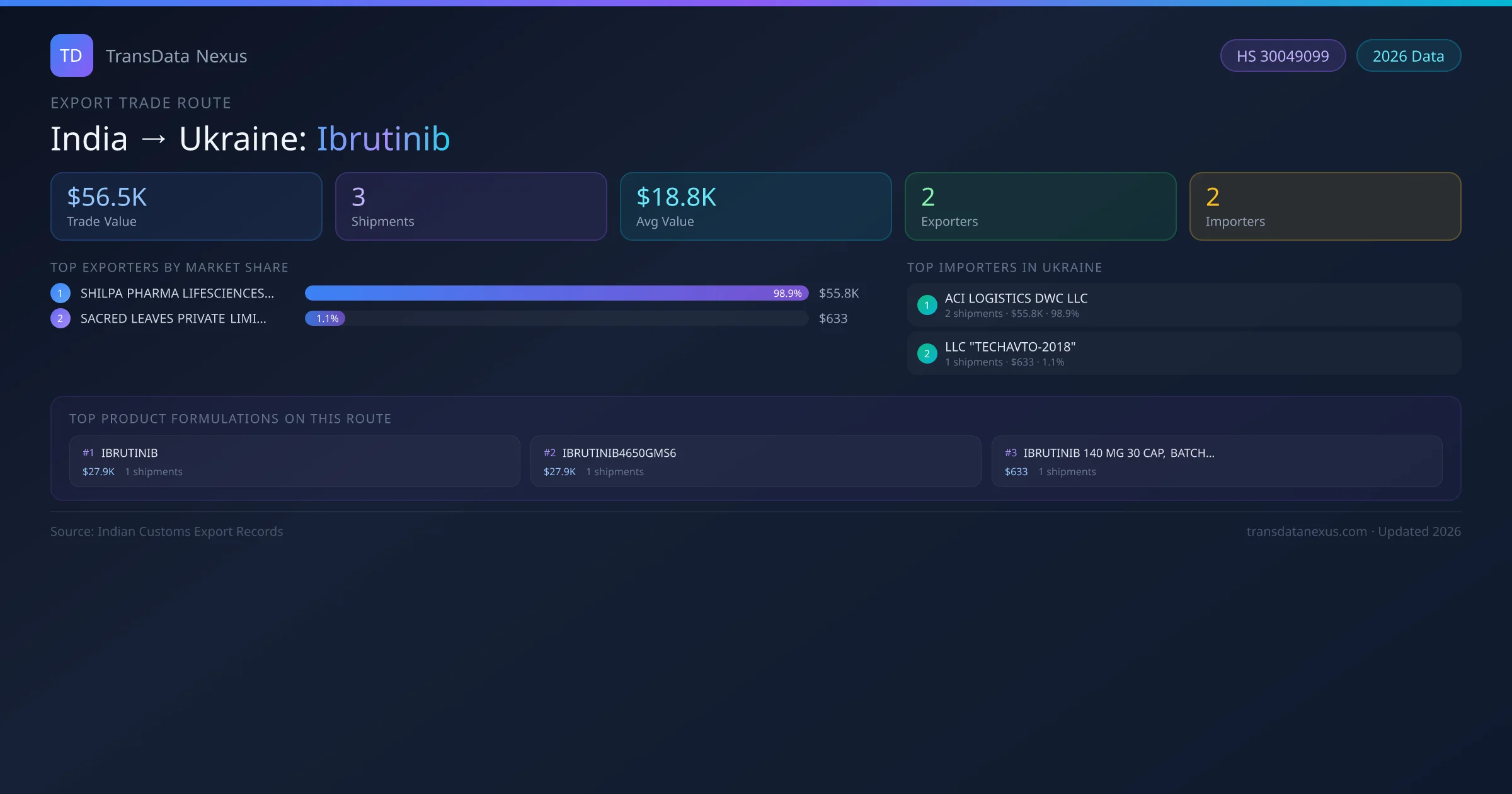 The India to Ukraine Ibrutinib corridor is one of India's established pharmaceutical export routes, with 3 shipments documented worth a combined $56.5K USD. The route is dominated by SHILPA PHARMA LIFESCIENCES LIMITED, which alone accounts for roughly 99% of all export value, reflecting the consolidated nature of India's ibrutinib manufacturing sector.