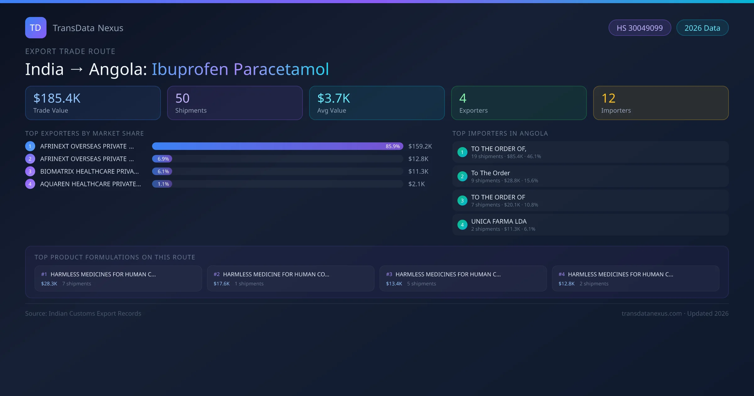 India has recorded 50 verified shipments of Ibuprofen Paracetamol exported to Angola, representing a combined trade value of $185.4K USD. This corridor is served by 4 active Indian exporters, with an average shipment value of $3.7K USD. The leading Indian exporter is AFRINEXT OVERSEAS PRIVATE LIMITED, which accounts for 86% of total export value with 43 shipments worth $159.2K USD. On the buying side, TO THE ORDER OF, is the largest importer in Angola with $85.4K USD in purchases. The top 3 suppliers — AFRINEXT OVERSEAS PRIVATE LIMITED, AFRINEXT OVERSEAS PRIVATE LIMITED , BIOMATRIX HEALTHCARE PRIVATE LIMITED — together control 99% of total trade value on this route. All data sourced from Indian Customs (DGFT) shipping bill records. Values reported in FOB USD.