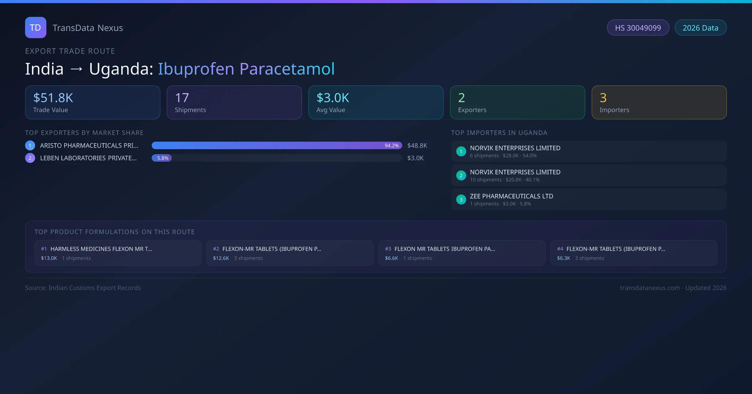 The India to Uganda Ibuprofen Paracetamol corridor is one of India's established pharmaceutical export routes, with 17 shipments documented worth a combined $51.8K USD. The route is dominated by ARISTO PHARMACEUTICALS PRIVATE LIMITED, which alone accounts for roughly 94% of all export value, reflecting the consolidated nature of India's ibuprofen paracetamol manufacturing sector.