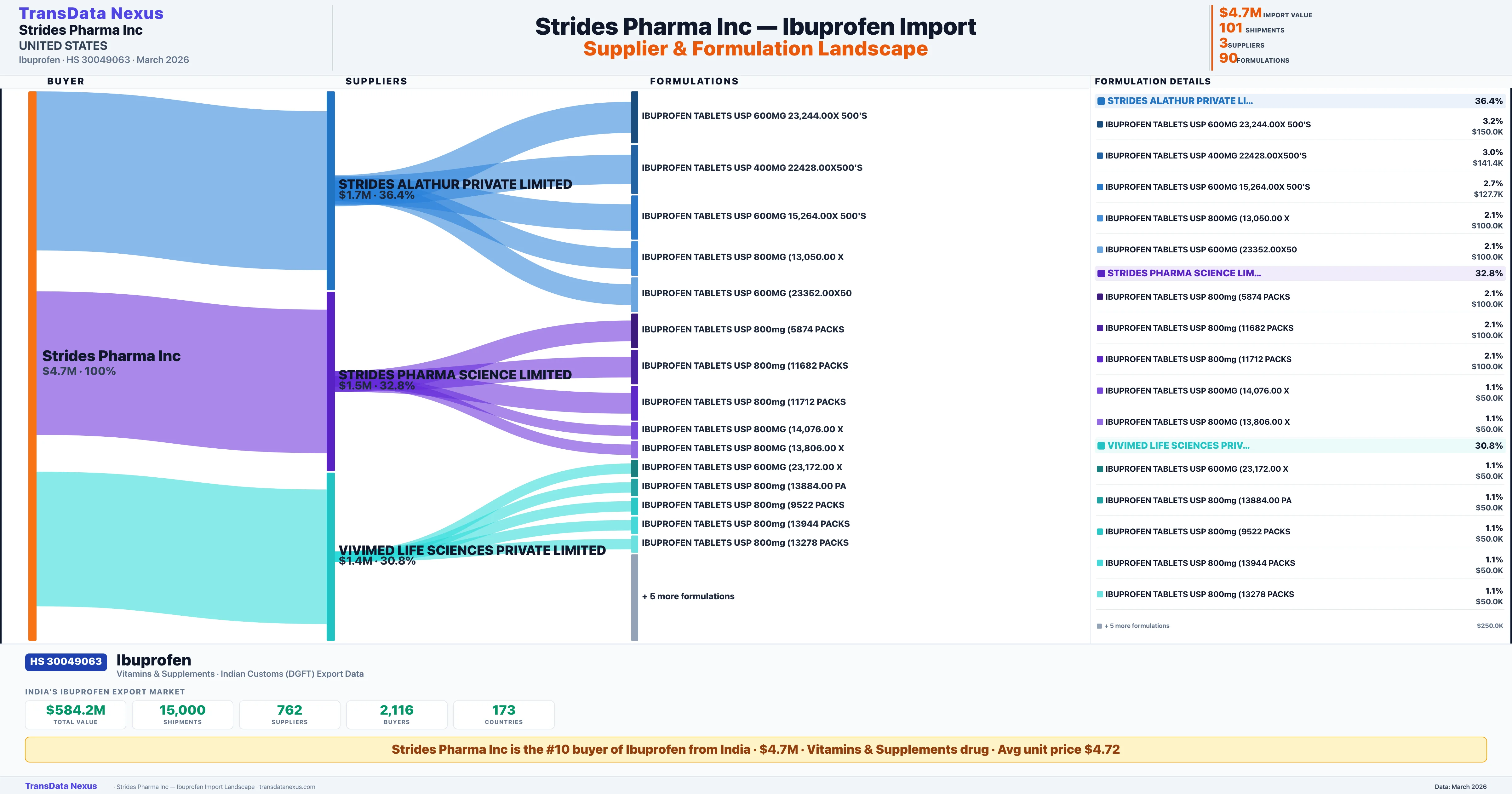 Access order-level details, pricing data, supplier connections, and competitive analysis for STRIDES PHARMA INC,'s Ibuprofen imports. TransData Nexus provides verified Indian Customs (DGFT) data trusted by pharmaceutical trade professionals worldwide.
