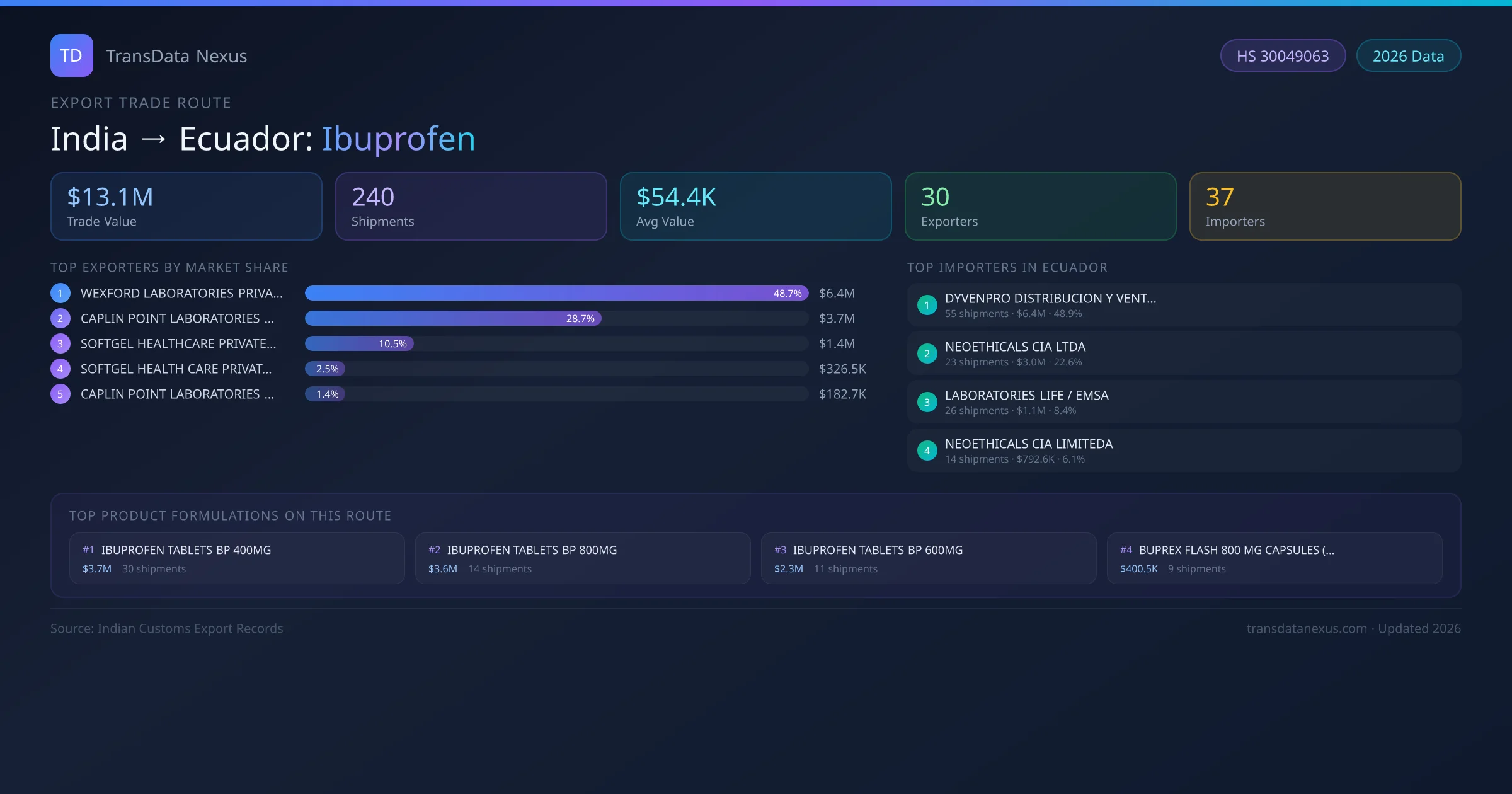 India has recorded 240 verified shipments of Ibuprofen exported to Ecuador, representing a combined trade value of $13.1M USD. This corridor is served by 30 active Indian exporters, with an average shipment value of $54.4K USD. The leading Indian exporter is WEXFORD LABORATORIES PRIVATE LIMITED, which accounts for 49% of total export value with 53 shipments worth $6.4M USD. On the buying side, DYVENPRO DISTRIBUCION Y VENTA DE is the largest importer in Ecuador with $6.4M USD in purchases. The top 3 suppliers — WEXFORD LABORATORIES PRIVATE LIMITED, CAPLIN POINT LABORATORIES LIMITED, SOFTGEL HEALTHCARE PRIVATE LIMITED — together control 88% of total trade value on this route. All data sourced from Indian Customs (DGFT) shipping bill records. Values reported in FOB USD.