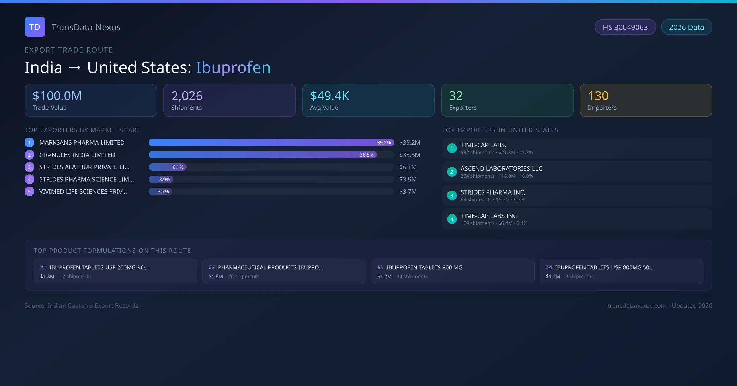 The India to United States Ibuprofen corridor is one of India's established pharmaceutical export routes, with 2,026 shipments documented worth a combined $100.0M USD. The route is dominated by MARKSANS PHARMA LIMITED, which alone accounts for roughly 39% of all export value, reflecting the consolidated nature of India's ibuprofen manufacturing sector.