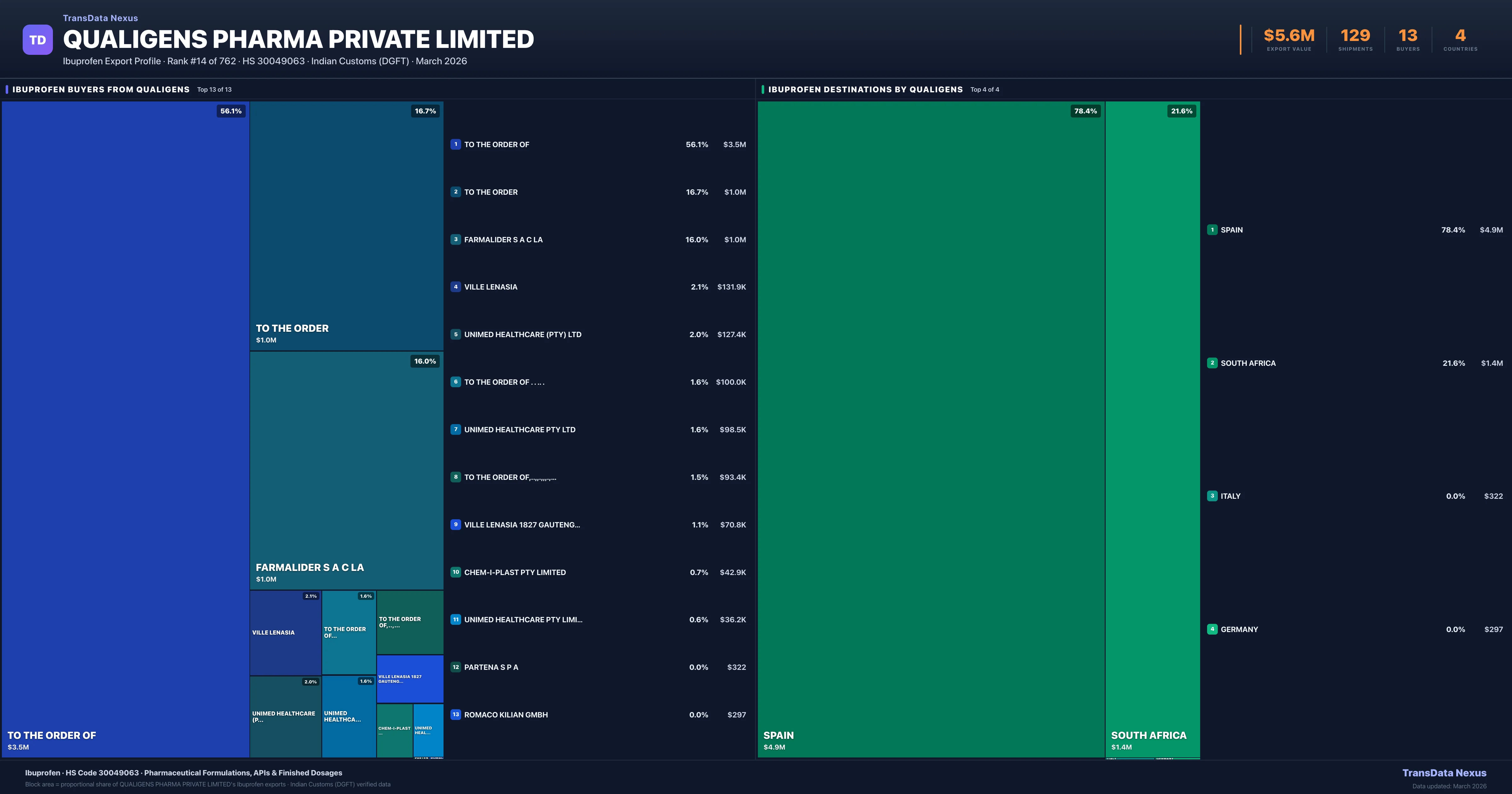 Qualigens Pharma Private Limited supplies Ibuprofen to 13 buyers globally. The largest buyer is TO THE ORDER OF (SPAIN), followed by TO THE ORDER (SPAIN) and FARMALIDER S A C LA (SPAIN). These buyers represent pharmaceutical distributors, hospital groups, and government procurement agencies in their respective markets.