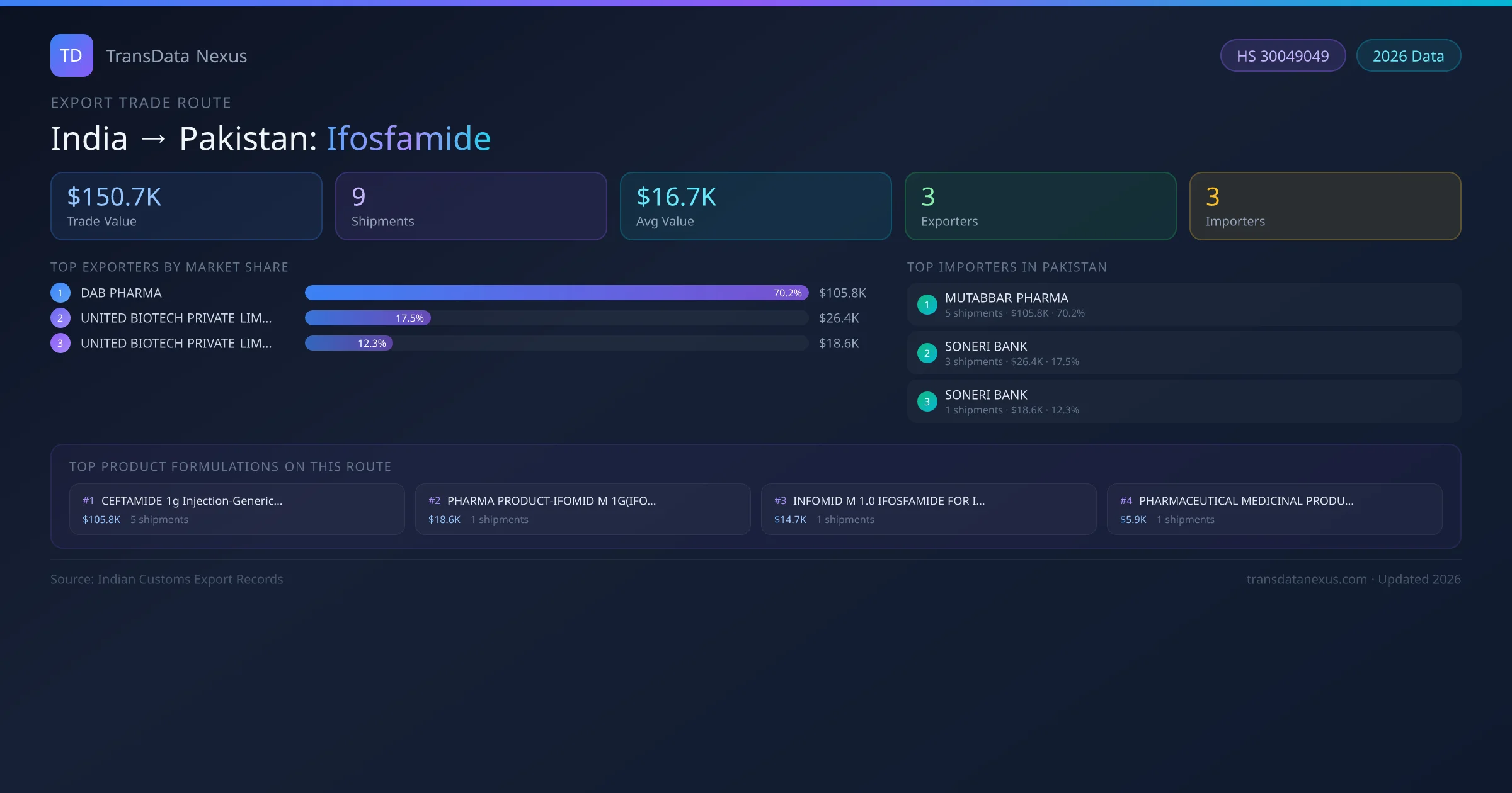 The India to Pakistan Ifosfamide corridor is one of India's established pharmaceutical export routes, with 9 shipments documented worth a combined $150.7K USD. The route is dominated by DAB PHARMA, which alone accounts for roughly 70% of all export value, reflecting the consolidated nature of India's ifosfamide manufacturing sector.