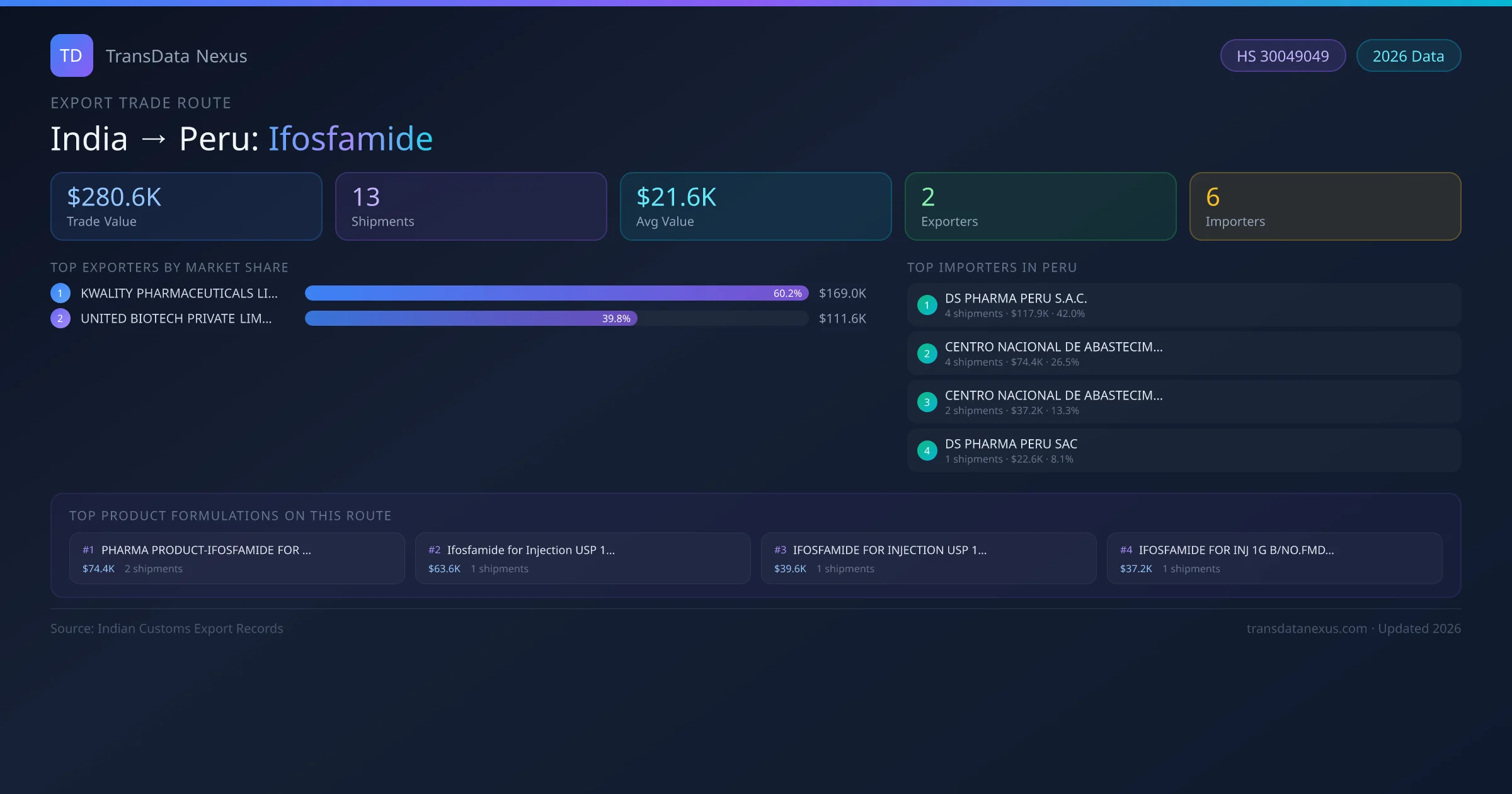 India has recorded 13 verified shipments of Ifosfamide exported to Peru, representing a combined trade value of $280.6K USD. This corridor is served by 2 active Indian exporters, with an average shipment value of $21.6K USD. The leading Indian exporter is KWALITY PHARMACEUTICALS LIMITED, which accounts for 60% of total export value with 7 shipments worth $169.0K USD. On the buying side, DS PHARMA PERU S.A.C. is the largest importer in Peru with $117.9K USD in purchases. All data sourced from Indian Customs (DGFT) shipping bill records. Values reported in FOB USD.