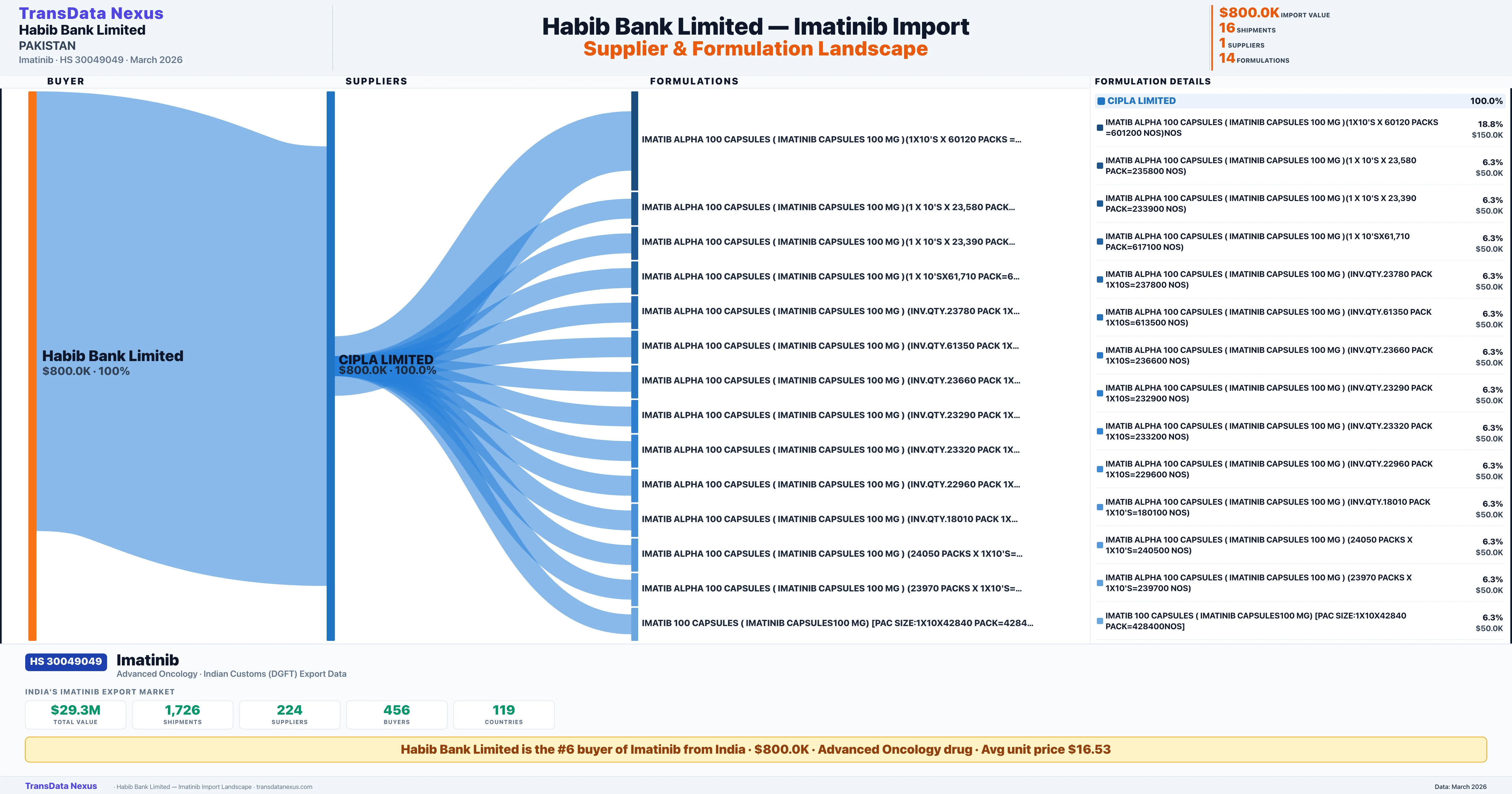 HABIB BANK LIMITED sources Imatinib from 1 verified Indian supplier: CIPLA LIMITED ($800.0K, 100.0%). This is based on 16 customs records.