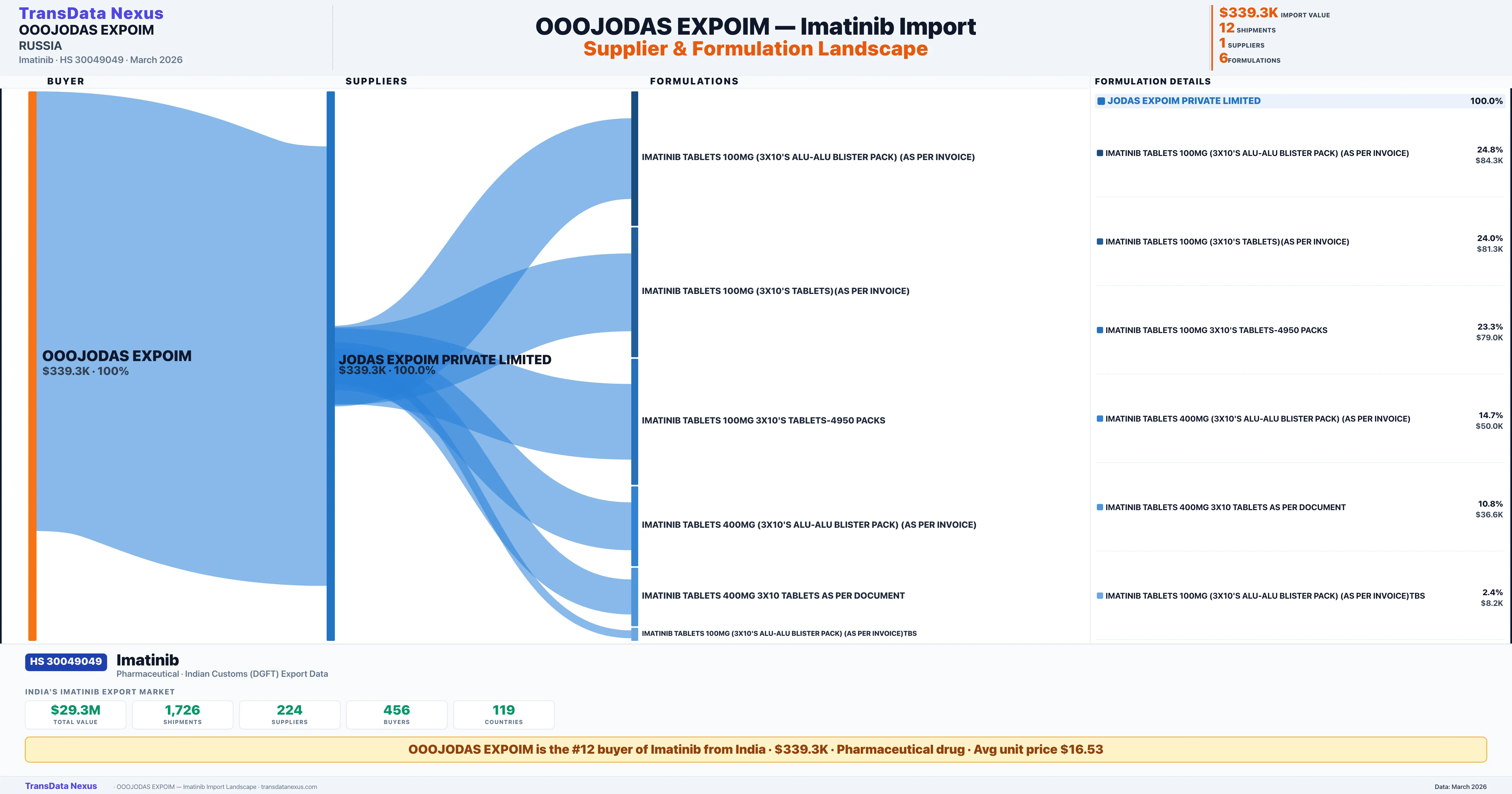 OOOJODAS EXPOIM sources Imatinib from 1 verified Indian supplier: JODAS EXPOIM PRIVATE LIMITED ($339.3K, 100.0%). This is based on 12 customs records.