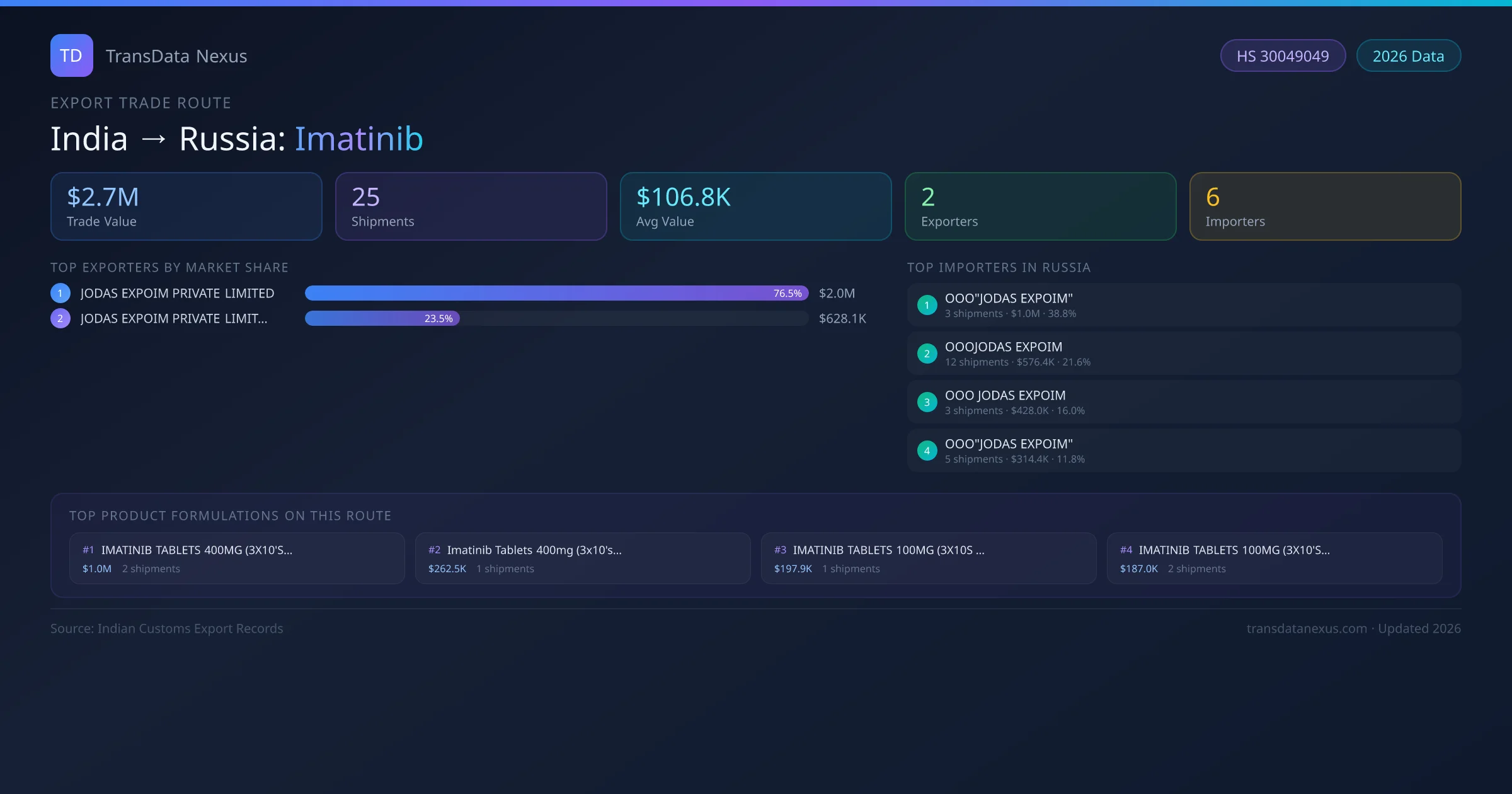 India exports Imatinib to Russia worth approximately $2.7M USD across 25 recorded shipments. The average value per shipment is $106.8K USD.