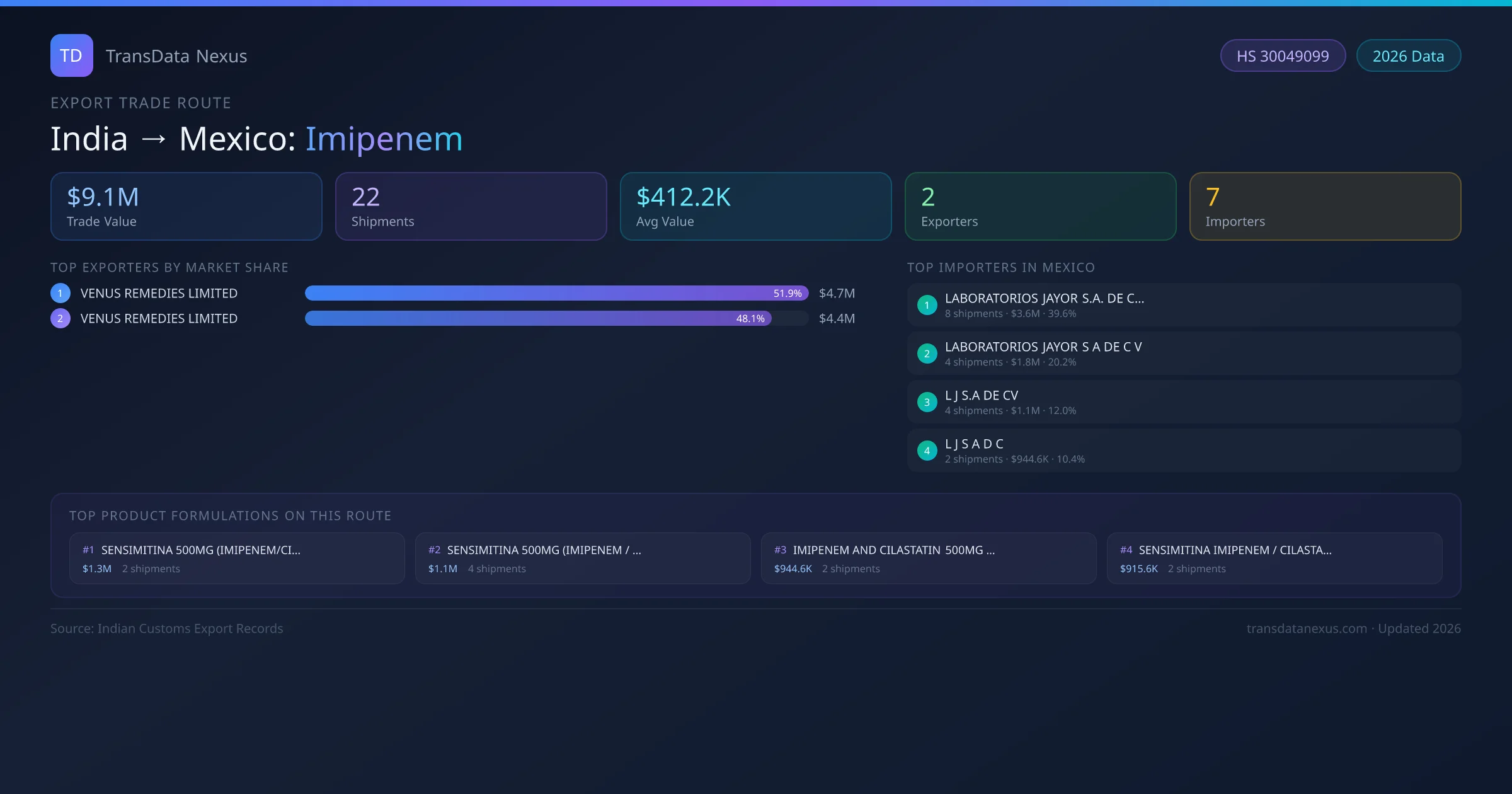 - 1.Route Identification: India to Mexico export trade corridor identified from Indian Customs (DGFT) records for Imipenem.