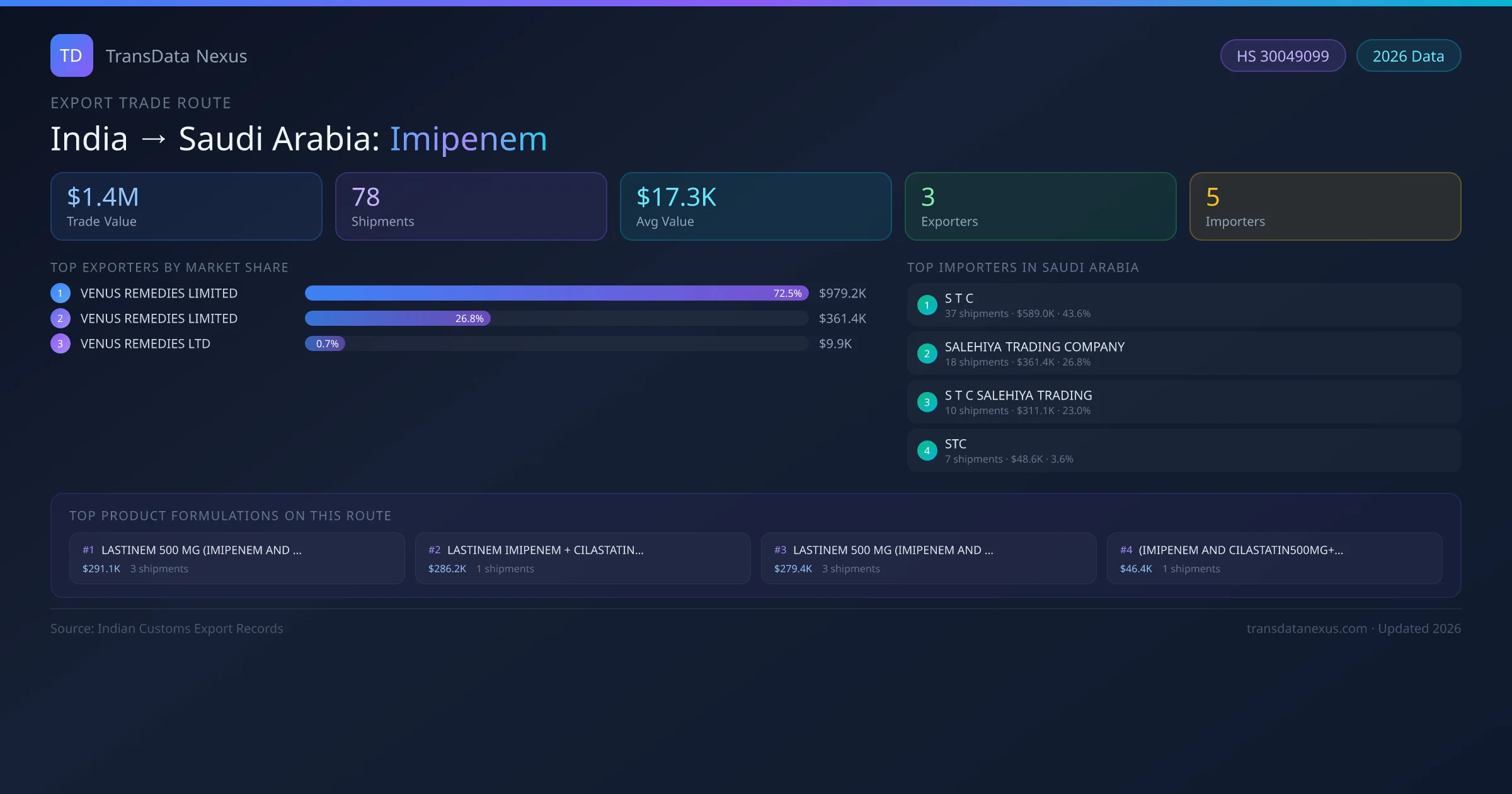 - 1.Route Identification: India to Saudi Arabia export trade corridor identified from Indian Customs (DGFT) records for Imipenem.
