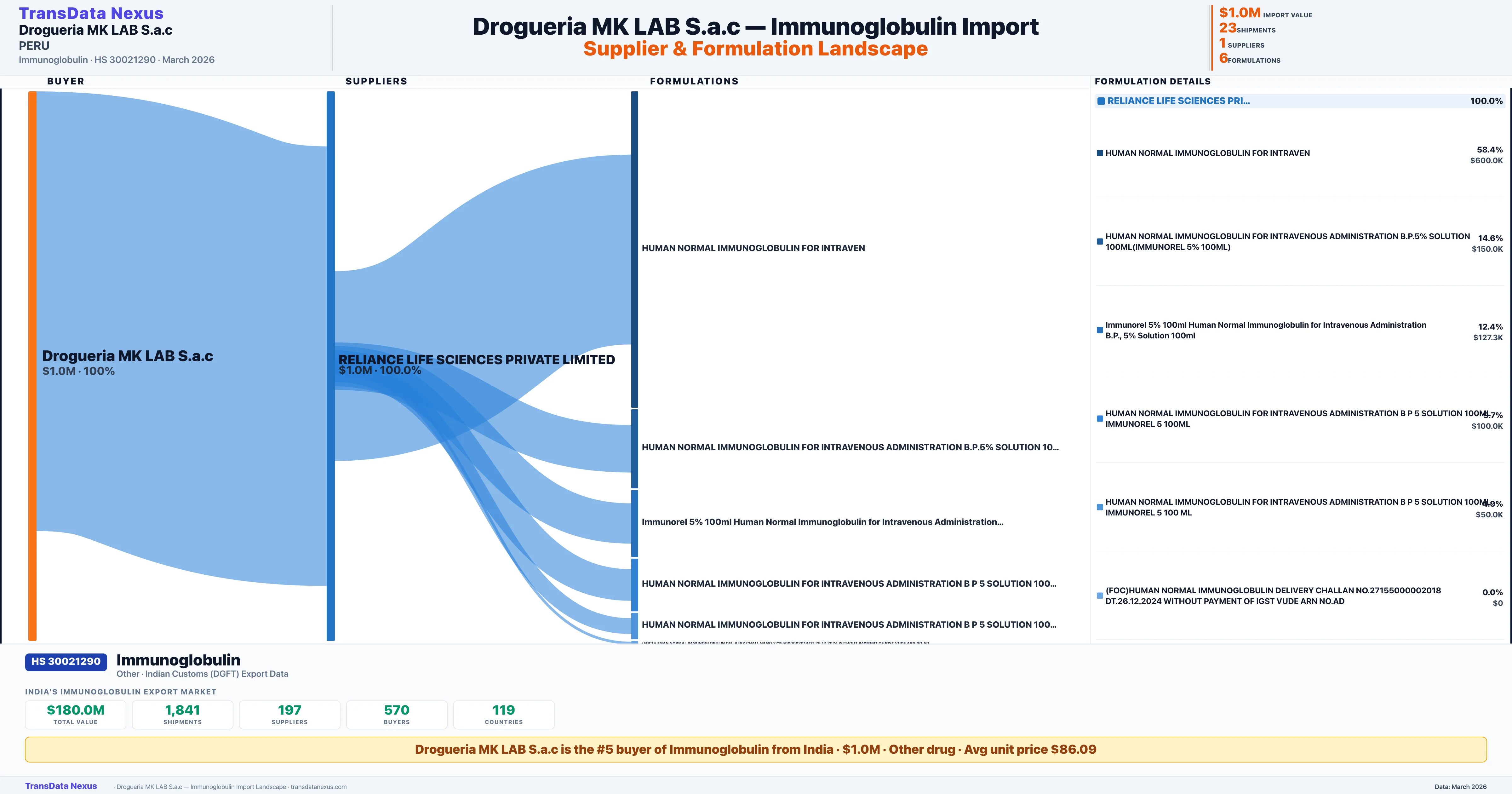 DROGUERIA MK LAB S.A.C sources Immunoglobulin from 1 verified Indian supplier: RELIANCE LIFE SCIENCES PRIVATE LIMITED ($1.0M, 100.0%). This is based on 23 customs records.