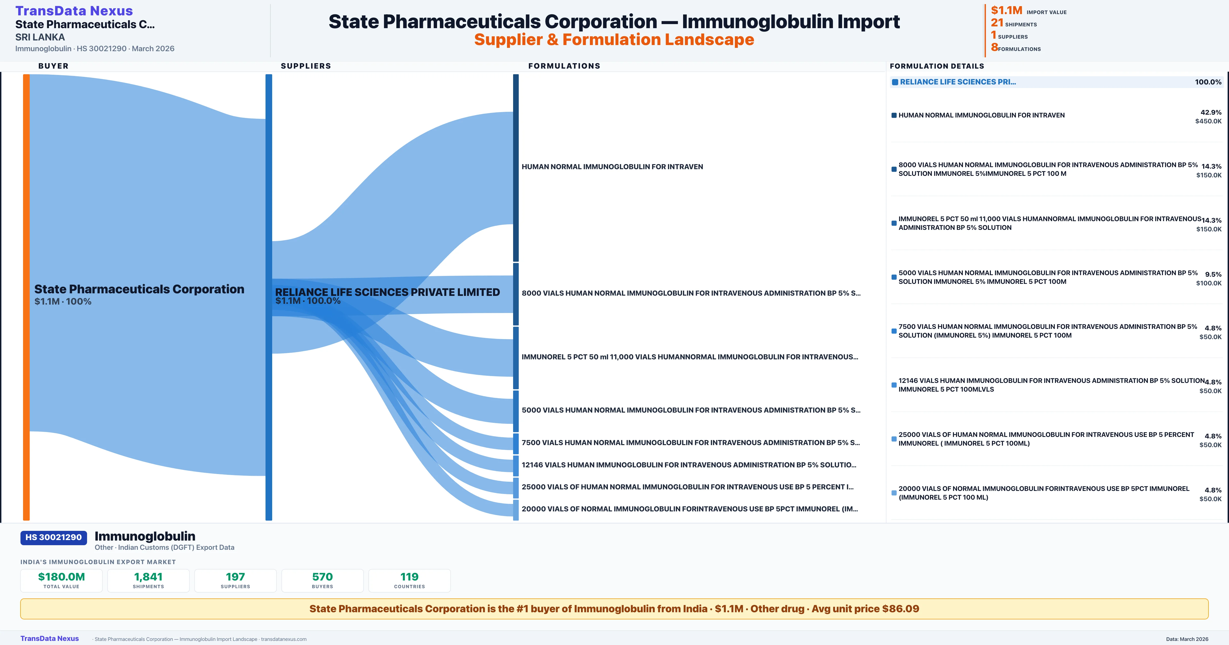 STATE PHARMACEUTICALS CORPORATION is the #1 importer of Immunoglobulin from India with $1.1M in import value and 21 verified shipments. STATE PHARMACEUTICALS CORPORATION holds a 0.5% market share in Immunoglobulin imports based in SRI LANKA. The company sources from 1 verified supplier across 8 formulations shipped to 1 country. Overall, STATE PHARMACEUTICALS CORPORATION imports 14 pharmaceutical products worth $4.2M across 8 therapeutic categories.