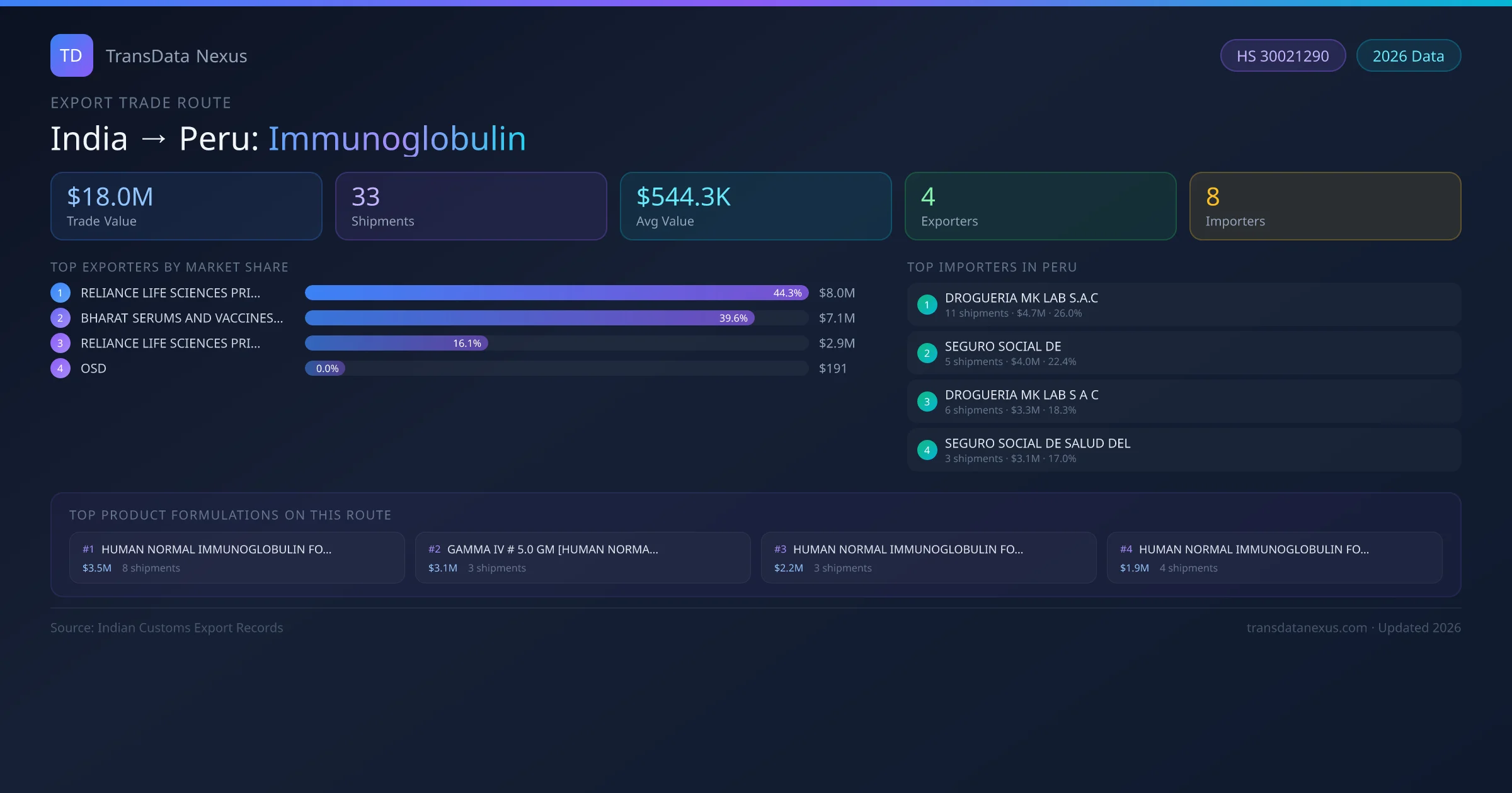 - 1.Route Identification: India to Peru export trade corridor identified from Indian Customs (DGFT) records for Immunoglobulin.