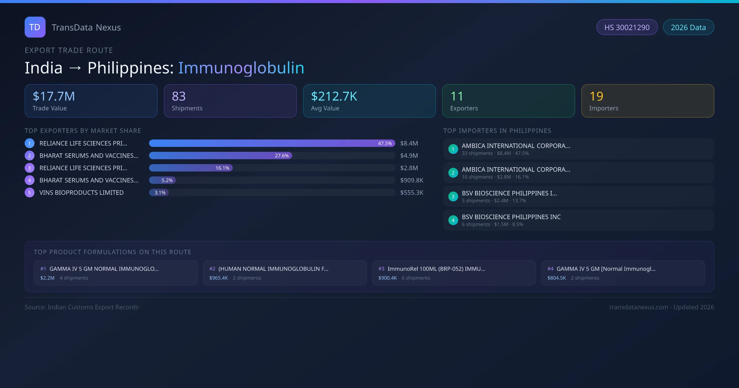 - 1.Route Identification: India to Philippines export trade corridor identified from Indian Customs (DGFT) records for Immunoglobulin.