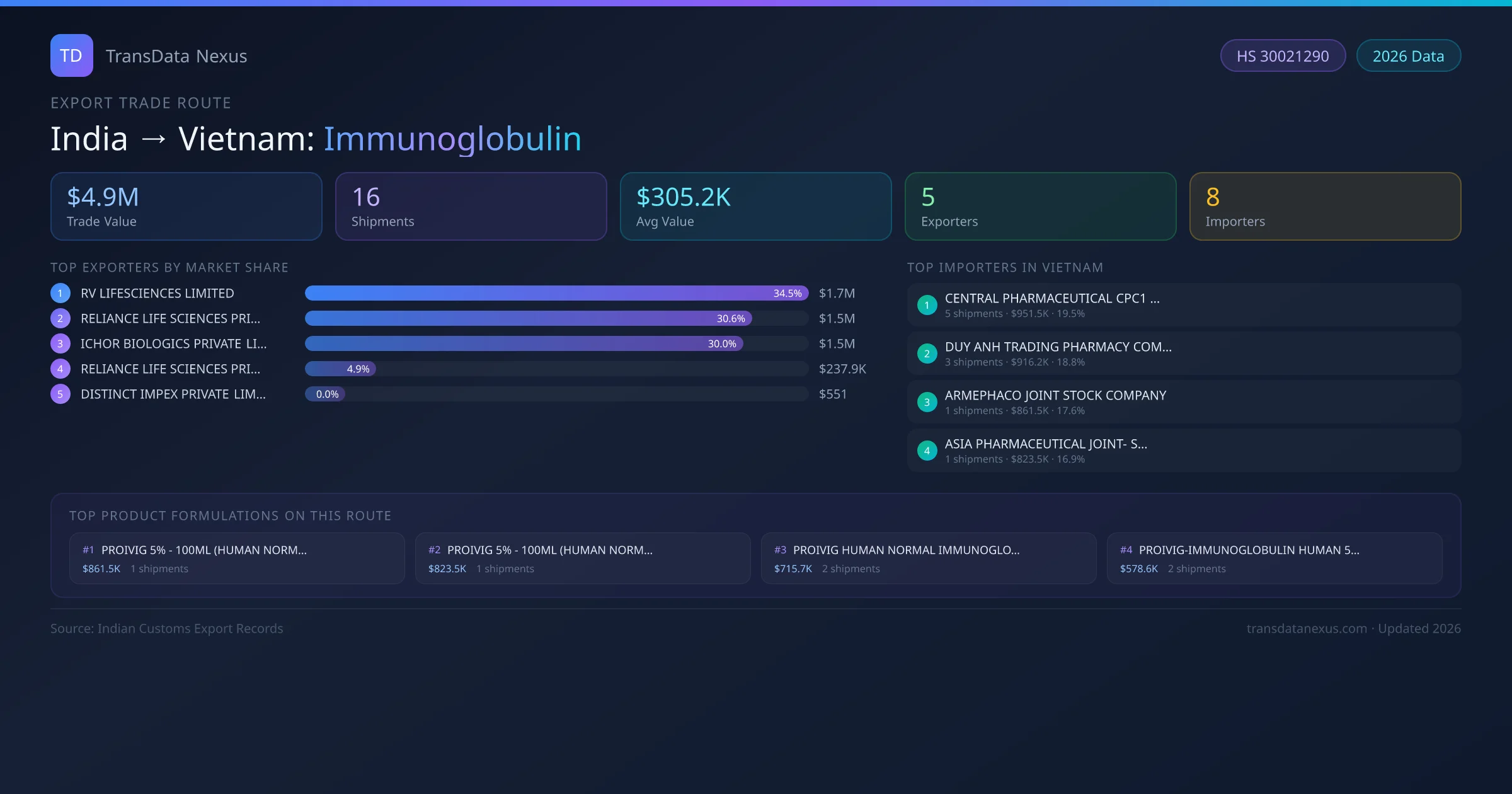 India exports Immunoglobulin to Vietnam worth approximately $4.9M USD across 16 recorded shipments. The average value per shipment is $305.2K USD.