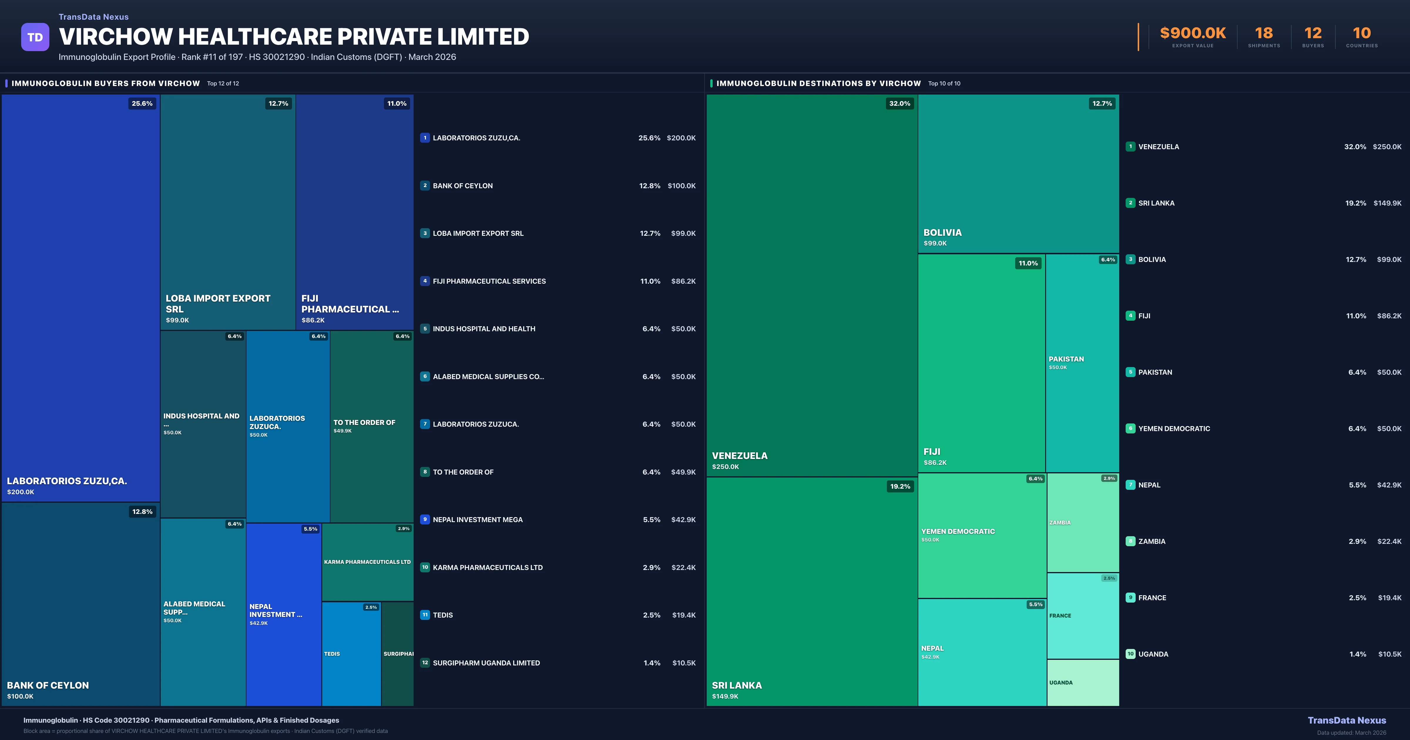 Virchow Healthcare Private Limited supplies Immunoglobulin to 12 buyers globally. The largest buyer is LABORATORIOS ZUZU,CA. (VENEZUELA), followed by BANK OF CEYLON (SRI LANKA) and LOBA IMPORT EXPORT SRL (BOLIVIA). These buyers represent pharmaceutical distributors, hospital groups, and government procurement agencies in their respective markets.