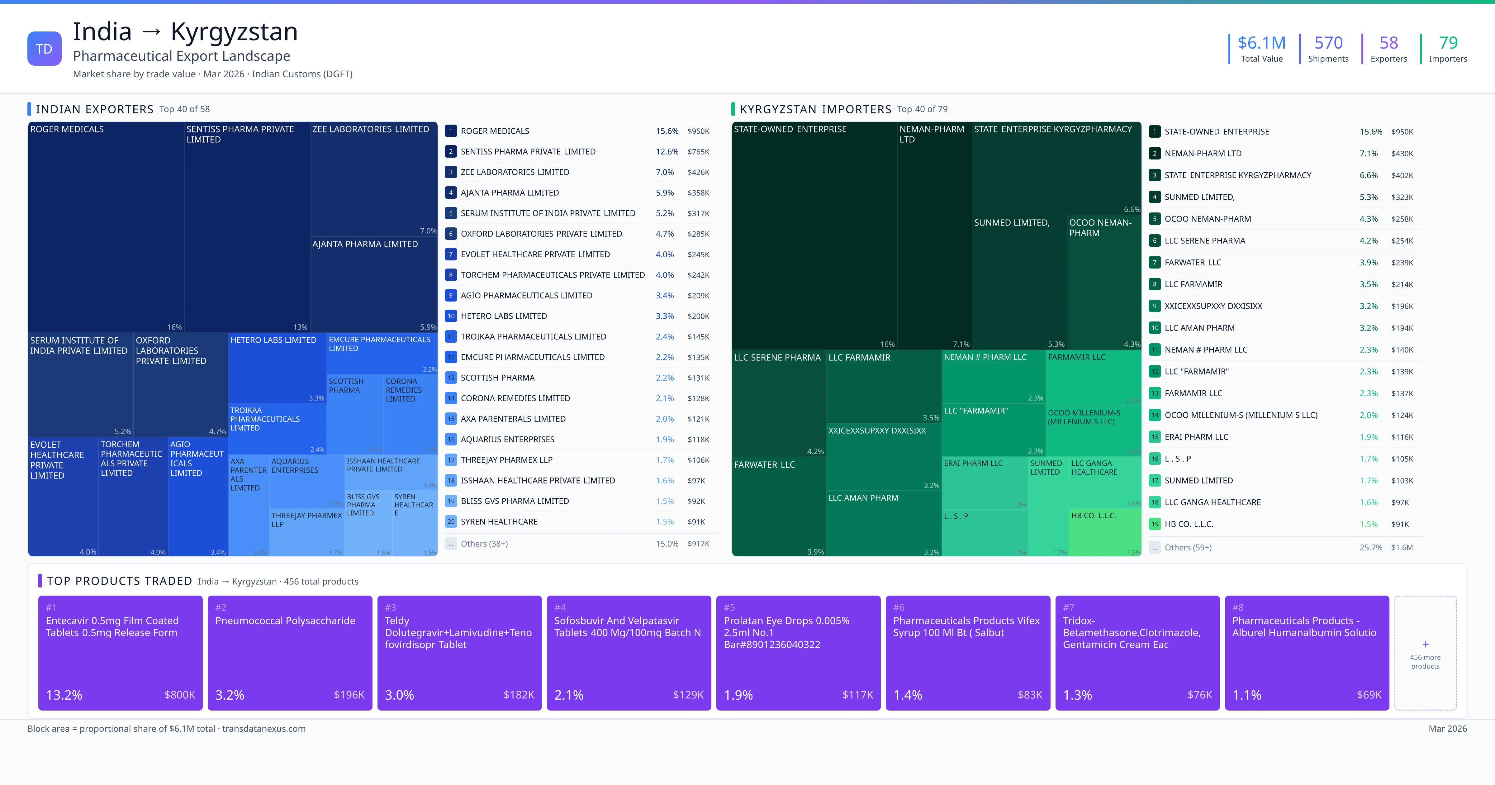 India exported $6.1M worth of pharmaceutical formulations to Kyrgyzstan across 570 verified shipments, sourced from 58 Indian exporters supplying 79 Kyrgyzstan buyers. The top exporters are ROGER MEDICALS ($949.6K) and SENTISS PHARMA PRIVATE LIMITED ($764.7K). The leading products are Dolutegravir ($182K) and Sofosbuvir ($129K). Average shipment value: $10.7K.