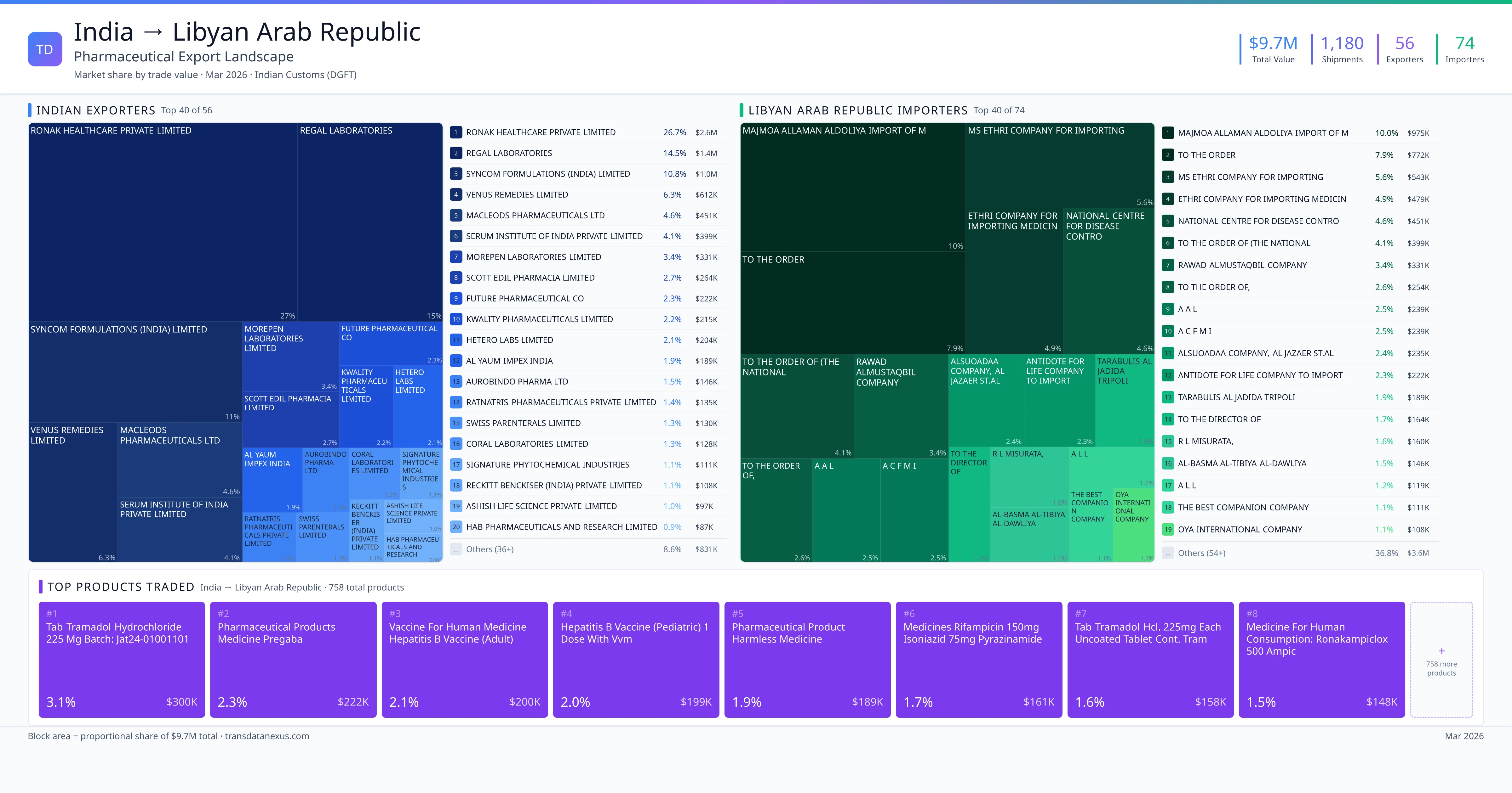 India exported $9.7M worth of pharmaceutical formulations to Libyan Arab Republic across 1,180 verified shipments, sourced from 56 Indian exporters supplying 74 Libyan Arab Republic buyers. The top exporters are RONAK HEALTHCARE PRIVATE LIMITED ($2.6M) and REGAL LABORATORIES ($1.4M). The leading products are Tramadol ($300K) and Vaccine ($200K). Average shipment value: $8.2K.
