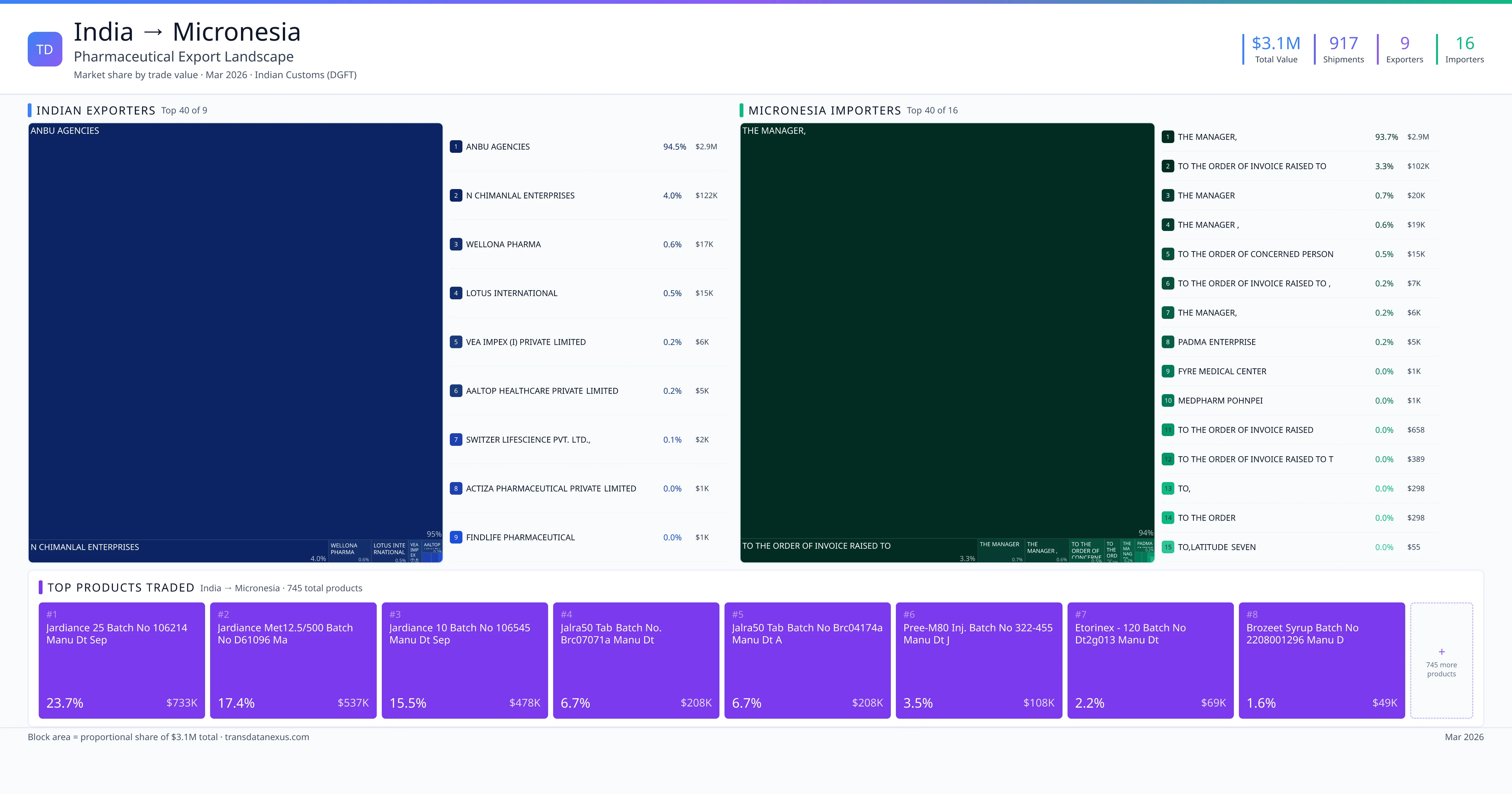 India exported $3.1M worth of pharmaceutical formulations to Micronesia across 917 verified shipments, sourced from 9 Indian exporters supplying 16 Micronesia buyers. The top exporters are ANBU AGENCIES ($2.9M) and N CHIMANLAL ENTERPRISES ($122.3K). The leading products are Jardiance 25 Batch No 106214 Manu Dt Sep, Jardiance Met12.5/500 Batch No D61096 Ma, Jardiance 10 Batch No 106545 Manu Dt Sep. Average shipment value: $3.4K.