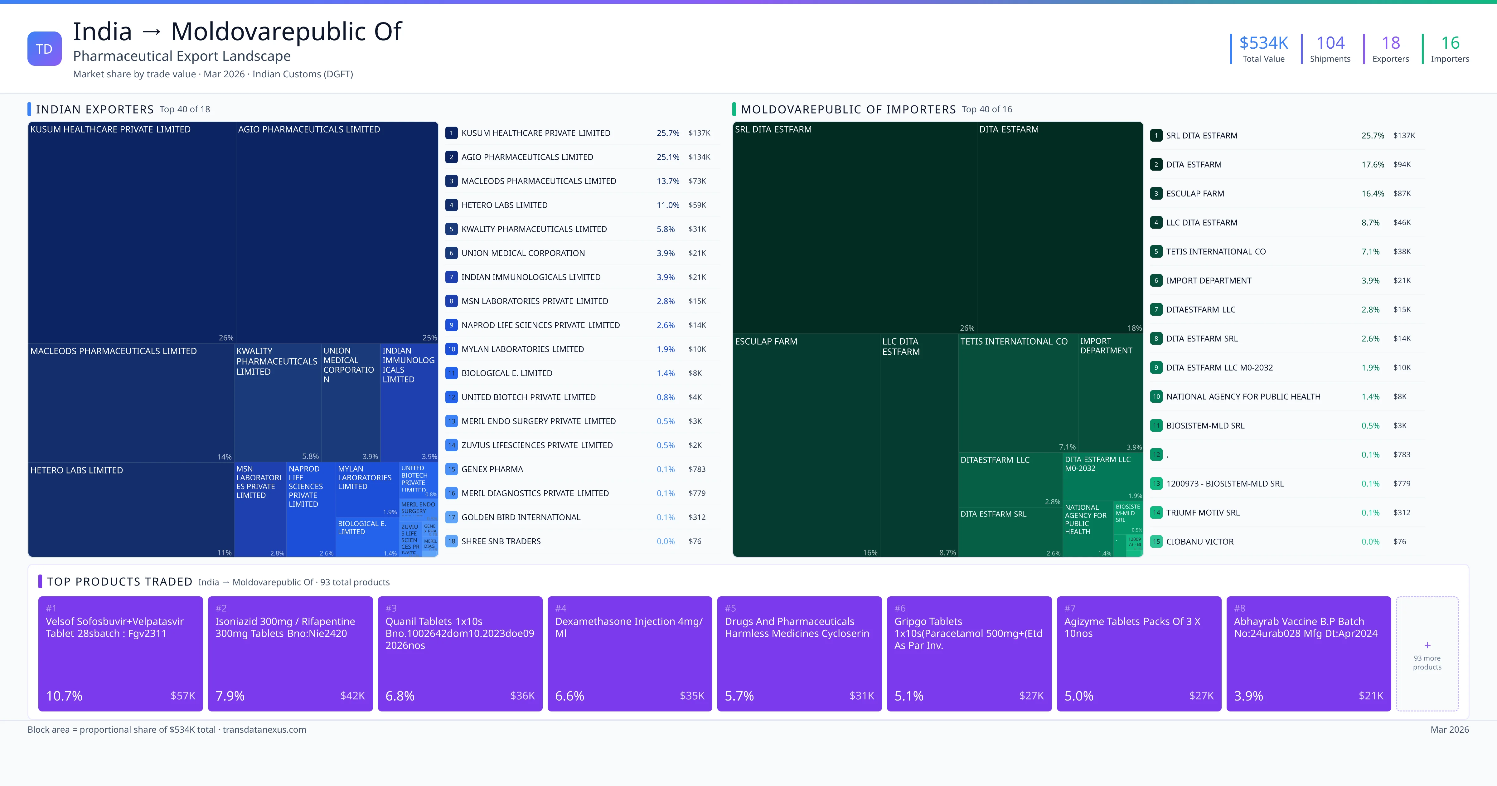 India exported $533.5K worth of pharmaceutical formulations to Moldovarepublic Of across 104 verified shipments, sourced from 18 Indian exporters supplying 16 Moldovarepublic Of buyers. The top exporters are KUSUM HEALTHCARE PRIVATE LIMITED ($136.9K) and AGIO PHARMACEUTICALS LIMITED ($133.9K). The leading products are Sofosbuvir ($57K) and Isoniazid ($42K). Average shipment value: $5.1K.