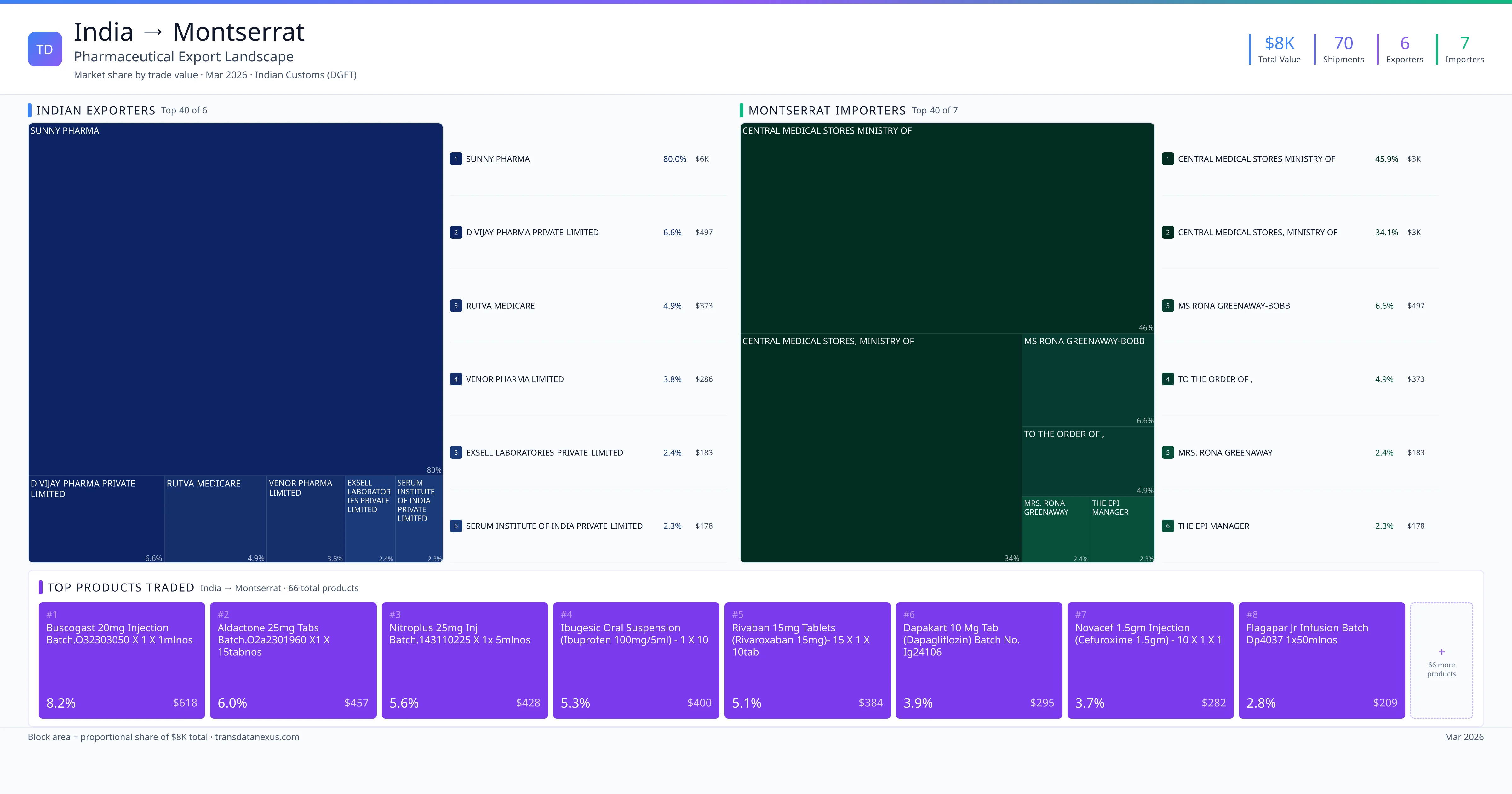 India exported $7.6K worth of pharmaceutical formulations to Montserrat across 70 verified shipments, sourced from 6 Indian exporters supplying 7 Montserrat buyers. The top exporters are SUNNY PHARMA ($6.1K) and D VIJAY PHARMA PRIVATE LIMITED ($497). The leading products are Buscogast 20mg Injection Batch.o32303050 X 1 X 1mlnos, Aldactone 25mg Tablets Batch.o2a2301960 X1 X 15tabnos, Nitroplus 25mg Injection Batch.143110225 X 1x 5mlnos. Average shipment value: $108.