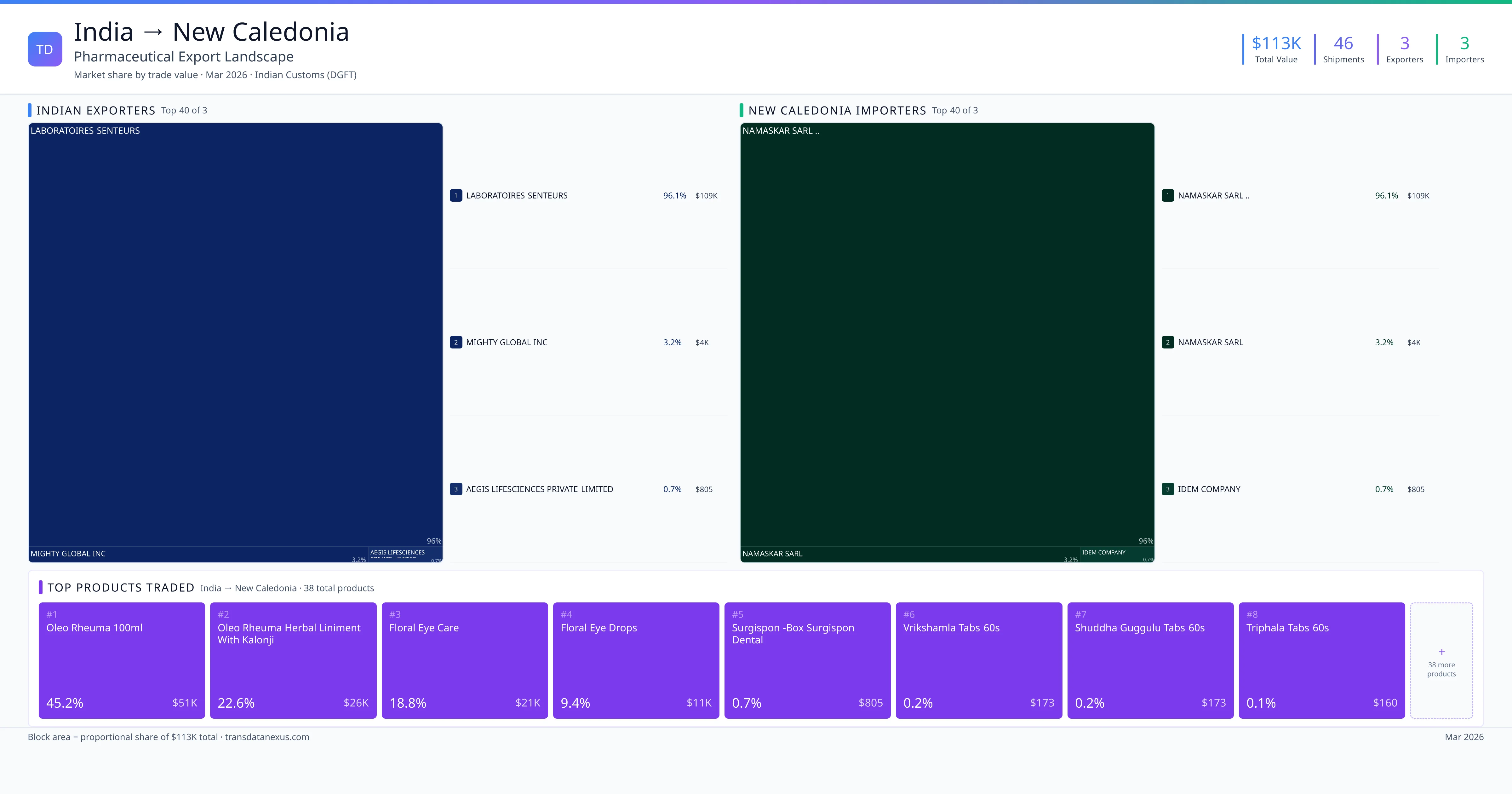India exported $113.3K worth of pharmaceutical formulations to New Caledonia across 46 verified shipments, sourced from 3 Indian exporters supplying 3 New Caledonia buyers. The top exporters are LABORATOIRES SENTEURS ($108.9K) and MIGHTY GLOBAL INC ($3.6K). The leading products are Herbal ($26K). Average shipment value: $2.5K.