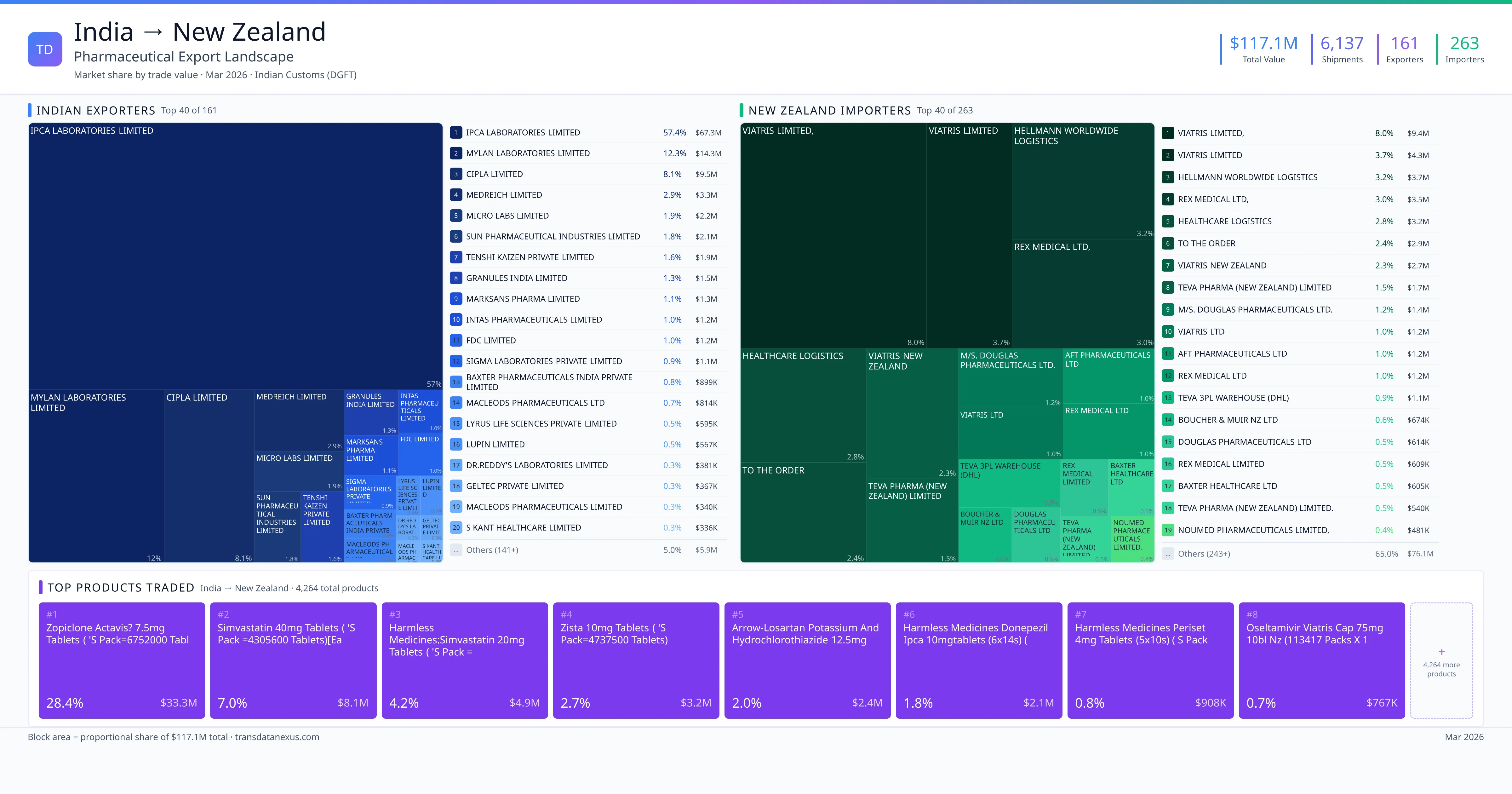 India exported pharmaceuticals worth $117.1M to New Zealand across 6,137 verified shipments.