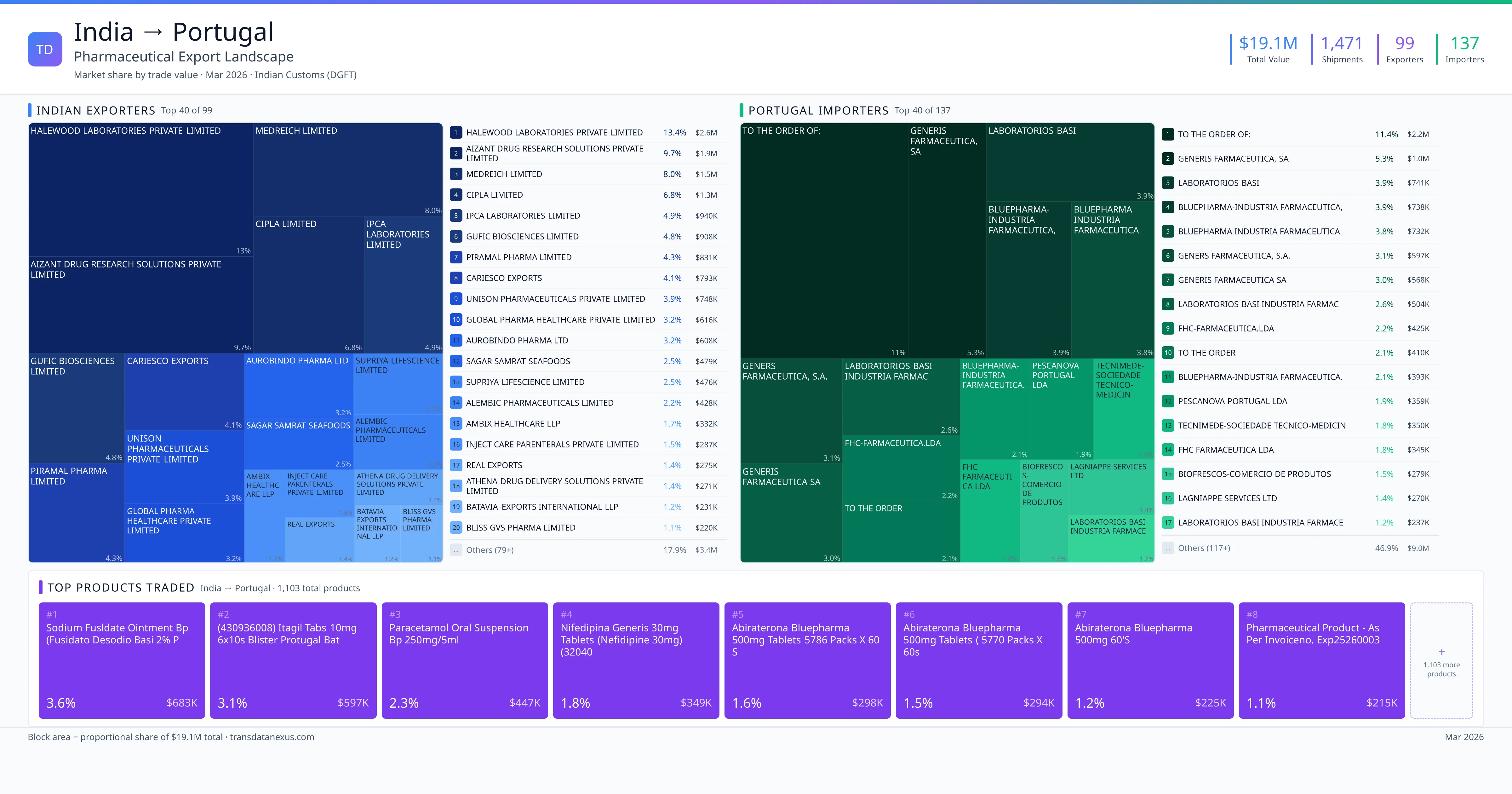 India exported $19.1M worth of pharmaceutical formulations to Portugal across 1,471 verified shipments, sourced from 99 Indian exporters supplying 137 Portugal buyers. The top exporters are HALEWOOD LABORATORIES PRIVATE LIMITED ($2.6M) and AIZANT DRUG RESEARCH SOLUTIONS PRIVATE LIMITED ($1.9M). The leading products are Sodium ($683K) and Paracetamol ($447K). Average shipment value: $13.0K.