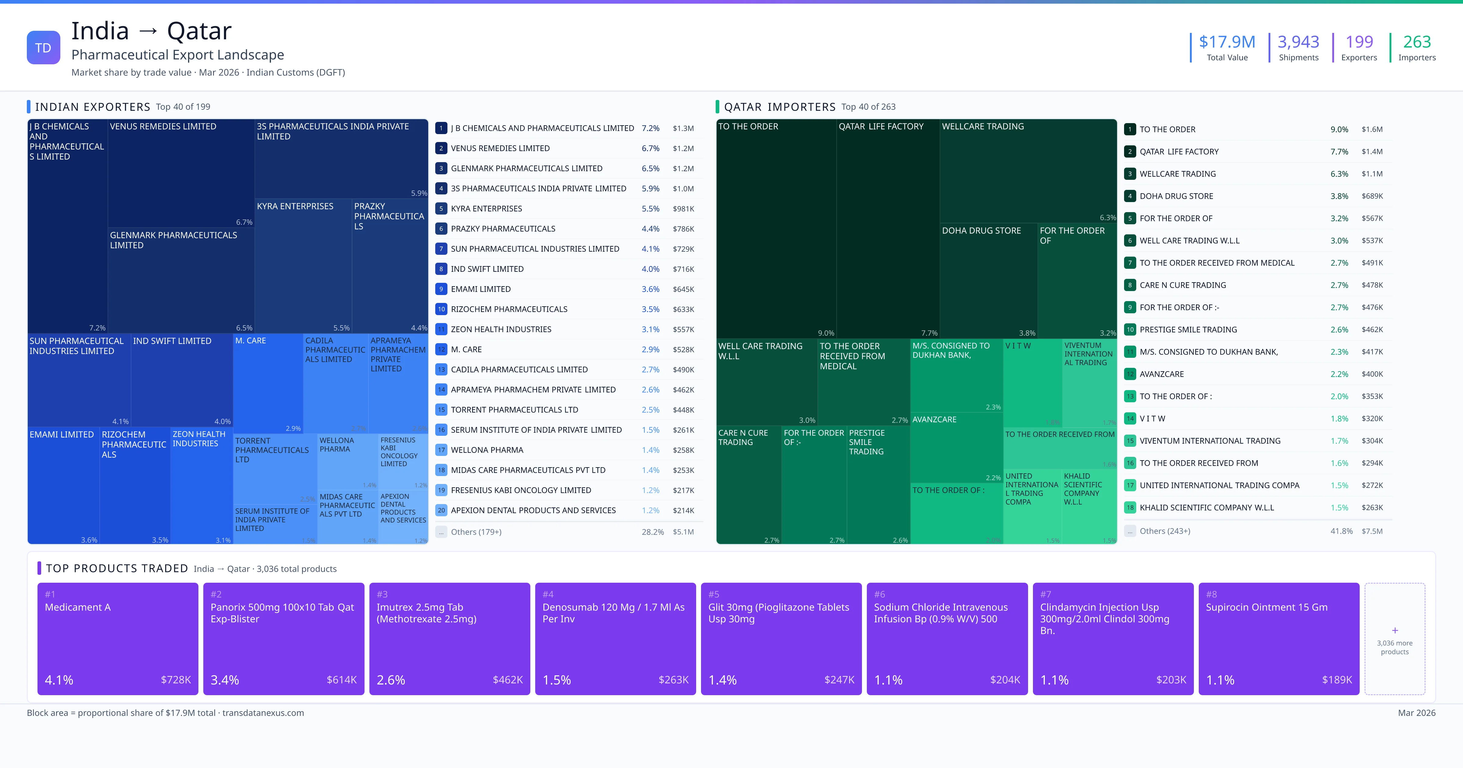 India exported $17.9M worth of pharmaceutical formulations to Qatar across 3,943 verified shipments, sourced from 199 Indian exporters supplying 263 Qatar buyers. The top exporters are J B CHEMICALS AND PHARMACEUTICALS LIMITED ($1.3M) and VENUS REMEDIES LIMITED ($1.2M). The leading products are Pioglitazone ($247K) and Sodium ($204K). Average shipment value: $4.6K.