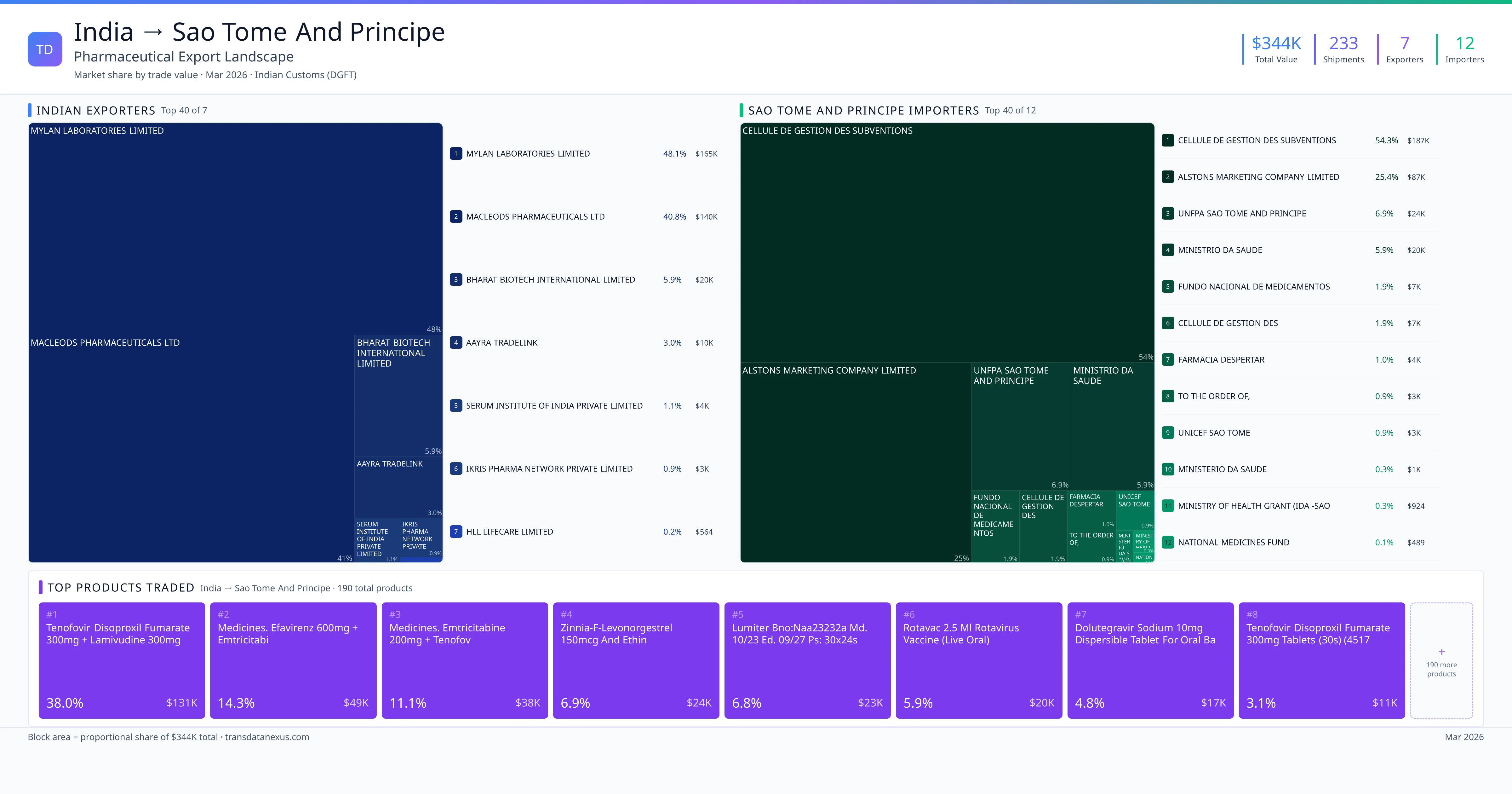 India exported $344.2K worth of pharmaceutical formulations to Sao Tome And Principe across 233 verified shipments, sourced from 7 Indian exporters supplying 12 Sao Tome And Principe buyers. The top exporters are MYLAN LABORATORIES LIMITED ($165.5K) and MACLEODS PHARMACEUTICALS LTD ($140.3K). The leading products are Tenofovir ($131K) and Efavirenz ($49K). Average shipment value: $1.5K.