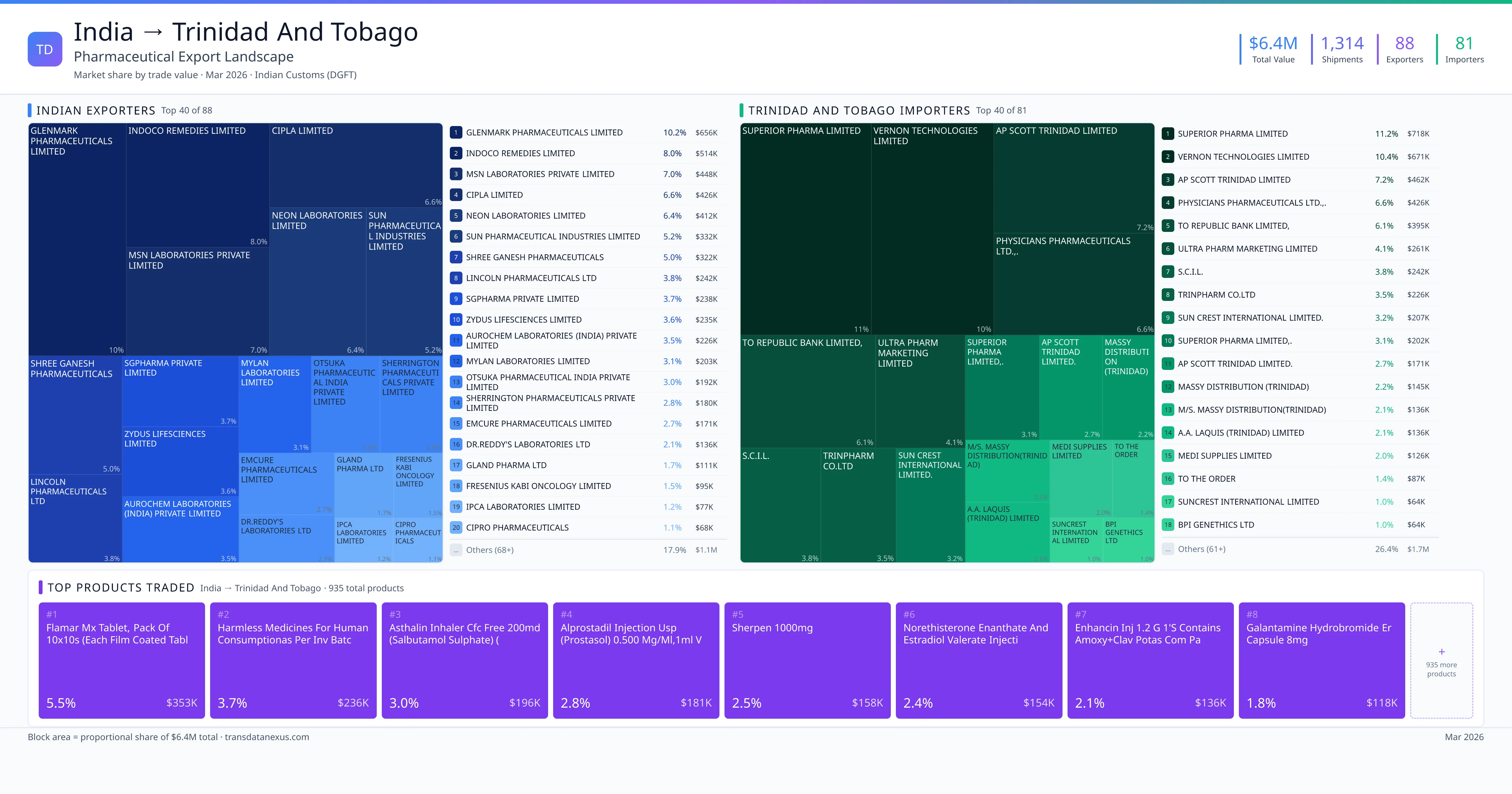 India exported $6.4M worth of pharmaceutical formulations to Trinidad And Tobago across 1,314 verified shipments, sourced from 88 Indian exporters supplying 81 Trinidad And Tobago buyers. The top exporters are GLENMARK PHARMACEUTICALS LIMITED ($655.8K) and INDOCO REMEDIES LIMITED ($514.1K). The leading products are Meropenem ($158K) and Tenofovir ($114K). Average shipment value: $4.9K.