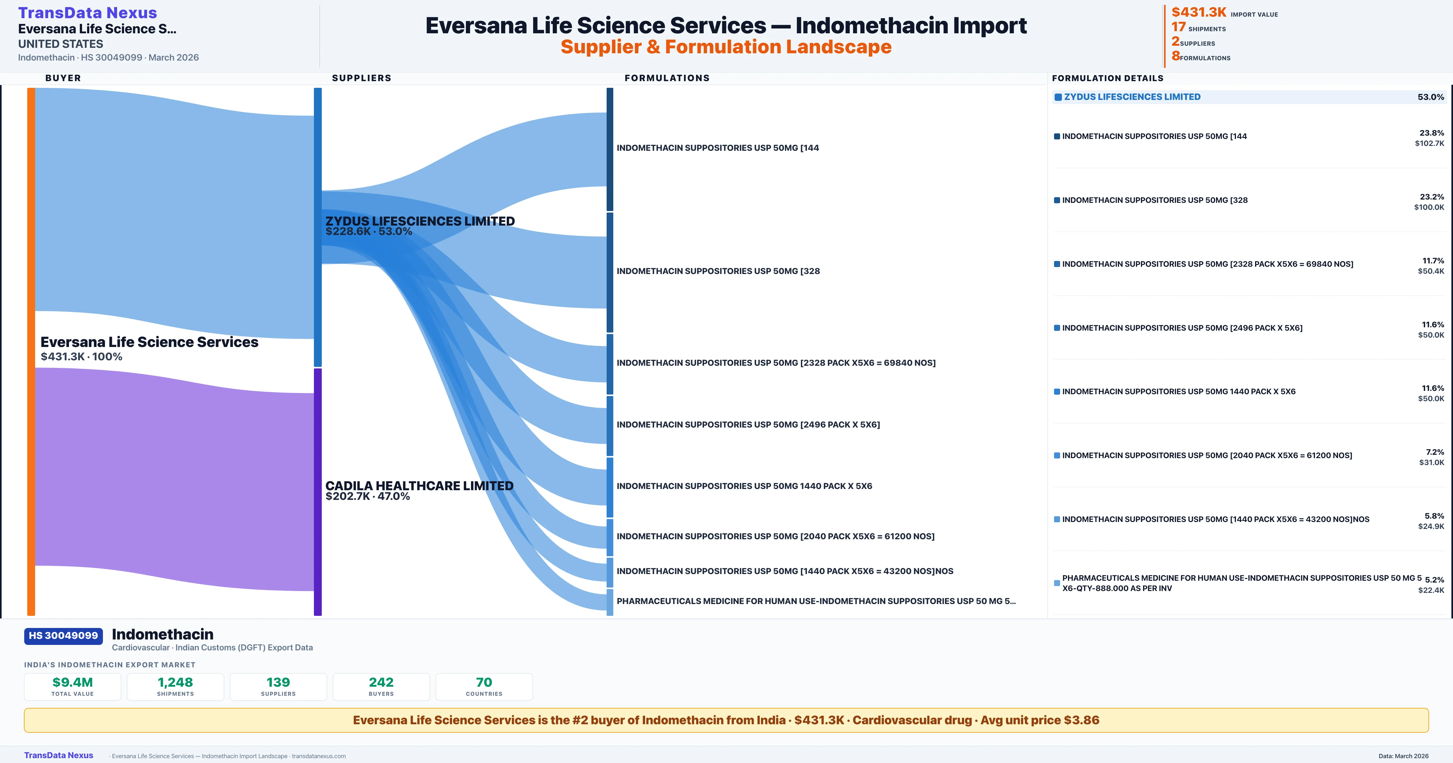 EVERSANA LIFE SCIENCE SERVICES sources Indomethacin from 2 verified Indian suppliers: ZYDUS LIFESCIENCES LIMITED ($228.6K, 53.0%), CADILA HEALTHCARE LIMITED ($202.7K, 47.0%). This is based on 17 customs records.