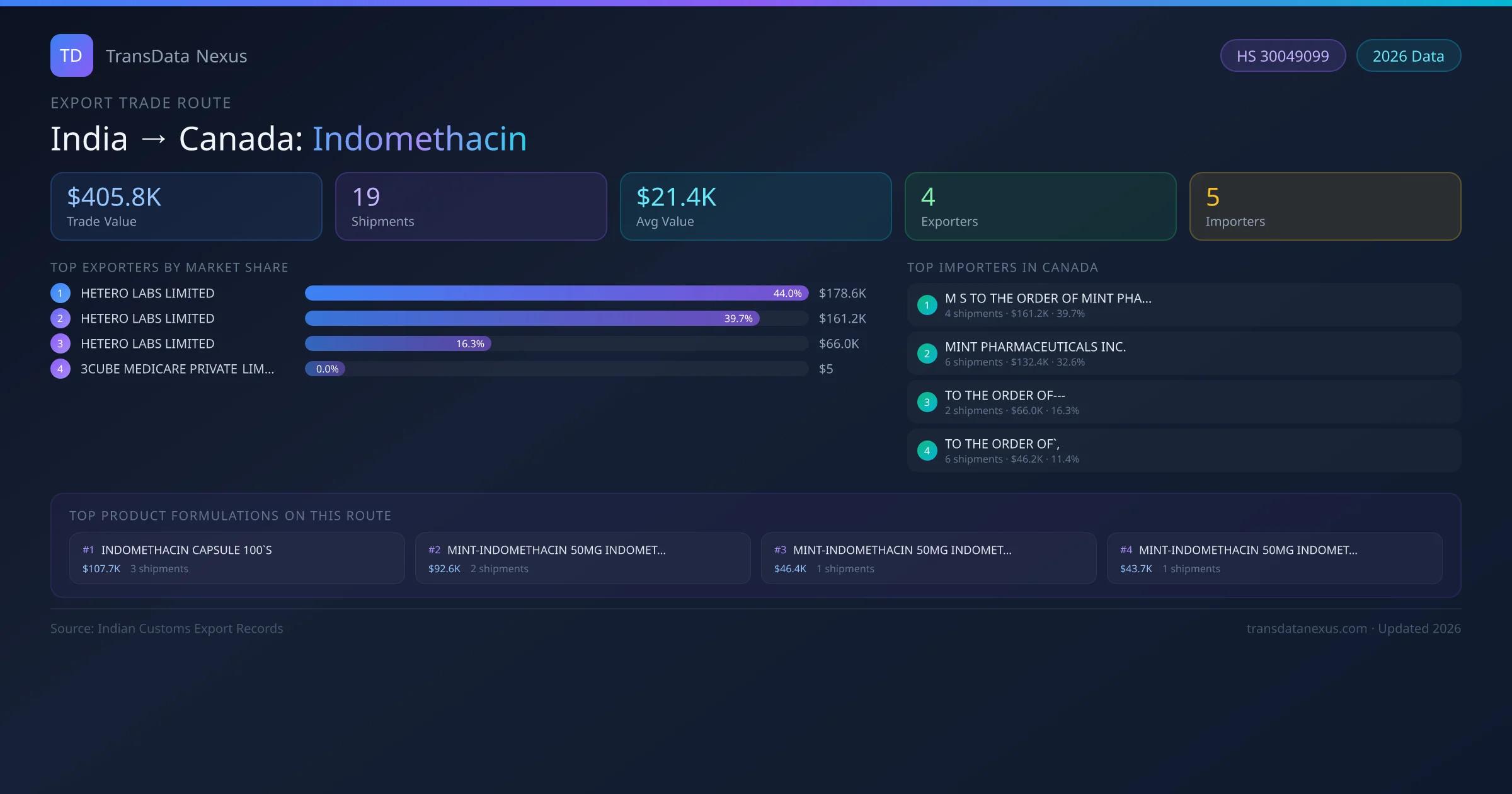 India has recorded 19 verified shipments of Indomethacin exported to Canada, representing a combined trade value of $405.8K USD. This corridor is served by 4 active Indian exporters, with an average shipment value of $21.4K USD. The leading Indian exporter is HETERO LABS LIMITED, which accounts for 44% of total export value with 12 shipments worth $178.6K USD. On the buying side, M S TO THE ORDER OF MINT PHARMACEUTICALS is the largest importer in Canada with $161.2K USD in purchases. The top 3 suppliers — HETERO LABS LIMITED, HETERO LABS LIMITED, HETERO LABS LIMITED — together control 100% of total trade value on this route. All data sourced from Indian Customs (DGFT) shipping bill records. Values reported in FOB USD.