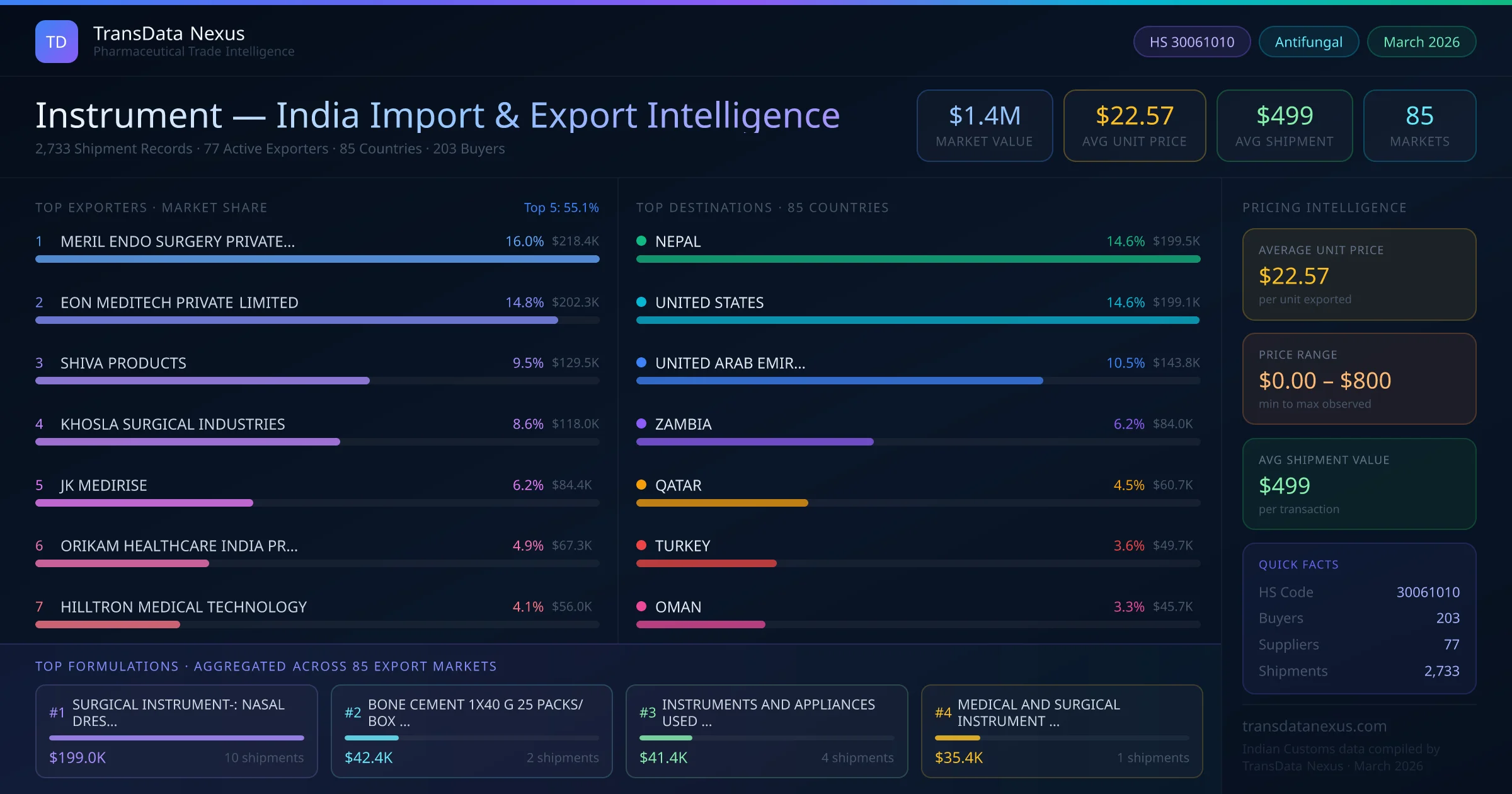 Between 2022 and 2026, India exported $1.4M worth of instrument across 2,733 verified shipments to 85 countries — covering 44% of world markets in the Medical Devices & Diagnostics segment. The largest destination is NEPAL (14.6%). MERIL ENDO SURGERY PRIVATE LIMITED leads with a 16.0% share. All figures are drawn from Indian Customs (DGFT) shipping bill records spanning four years of trade activity.