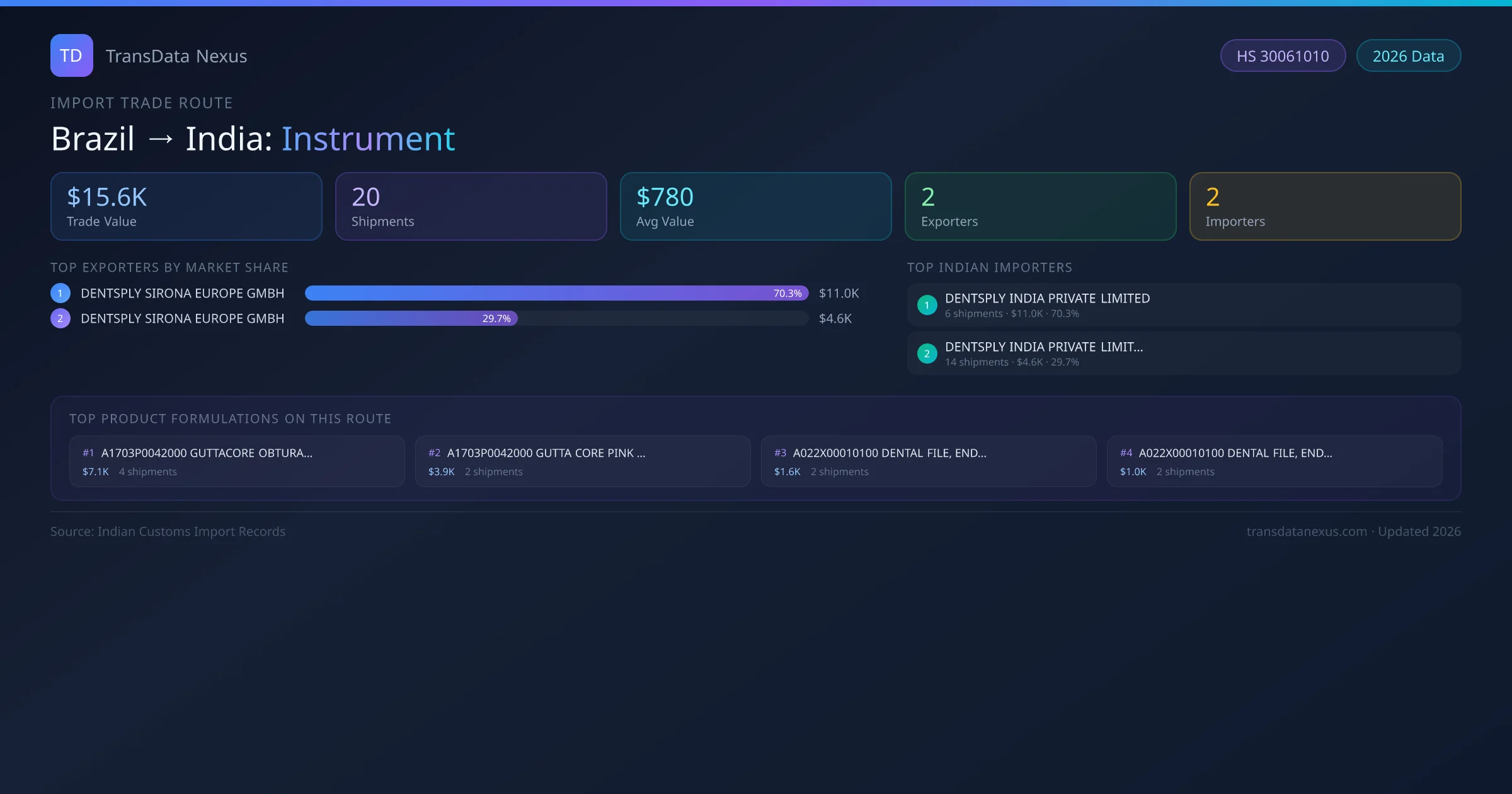 On the receiving end of this trade route, the leading Indian importers of Brazil instrument include DENTSPLY INDIA PRIVATE LIMITED, DENTSPLY INDIA PRIVATE LIMITED . The largest importer is DENTSPLY INDIA PRIVATE LIMITED, accounting for $11.0K USD across 6 shipments — representing 70% of all instrument imports from Brazil on this route.
