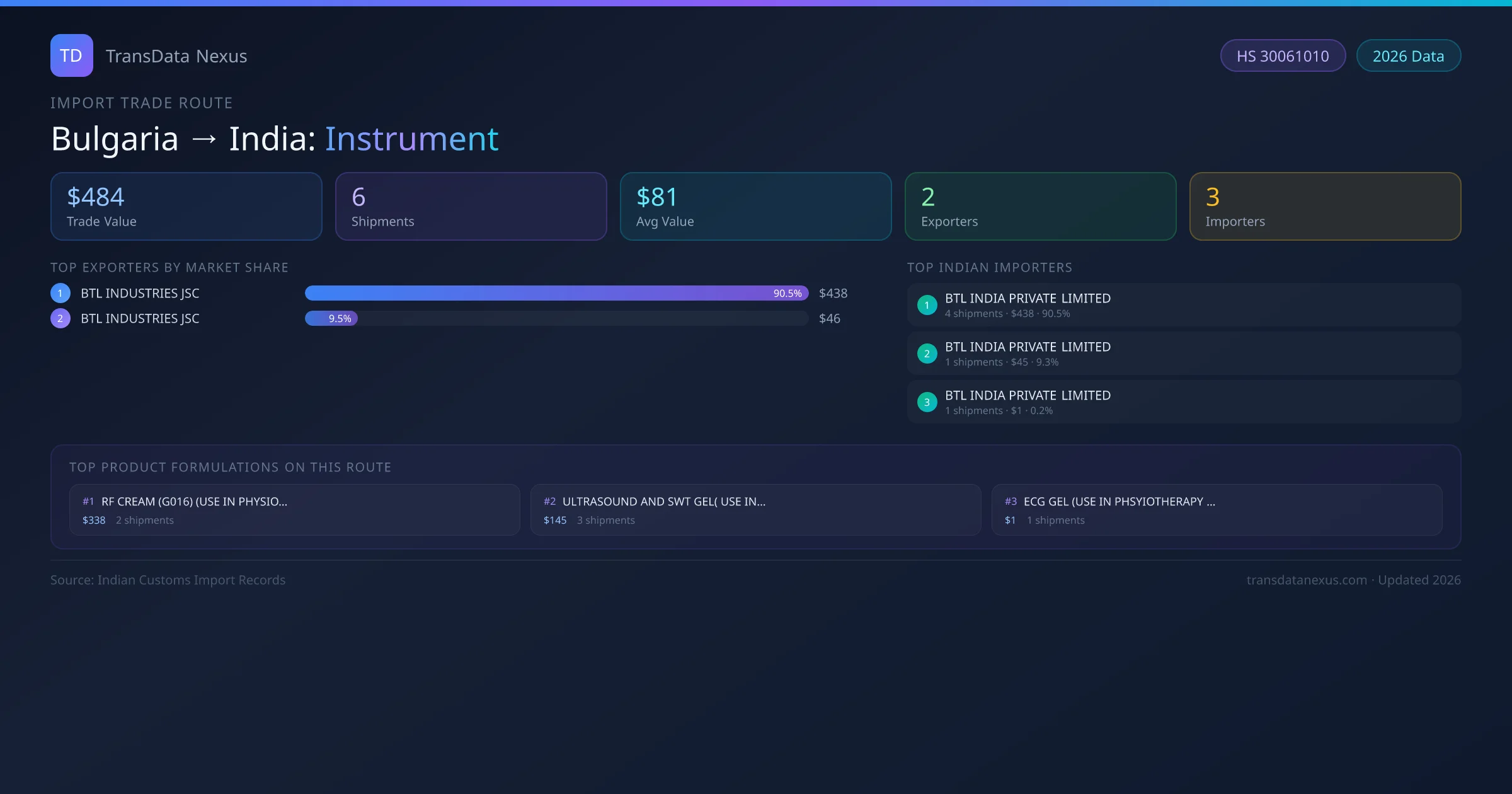 The Bulgaria to India Instrument corridor is one of India's established pharmaceutical import routes from Bulgaria, with 6 shipments documented worth a combined $484 USD. The route is dominated by BTL INDUSTRIES JSC , which alone accounts for roughly 90% of all import value, reflecting the consolidated nature of Bulgaria's instrument export sector.