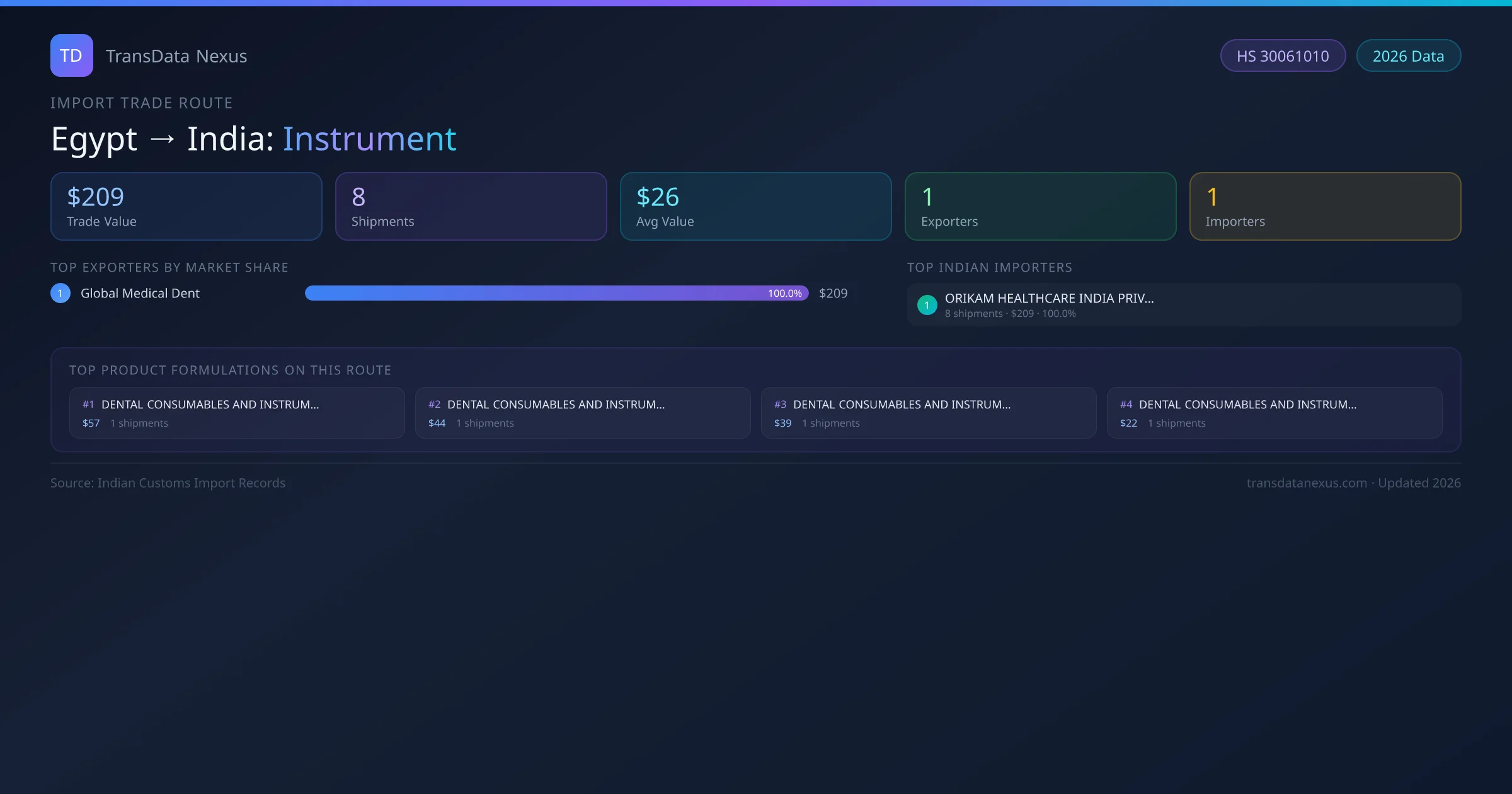 The Egypt to India Instrument corridor is one of India's established pharmaceutical import routes from Egypt, with 8 shipments documented worth a combined $209 USD. The route is dominated by Global Medical Dent, which alone accounts for roughly 100% of all import value, reflecting the consolidated nature of Egypt's instrument export sector.