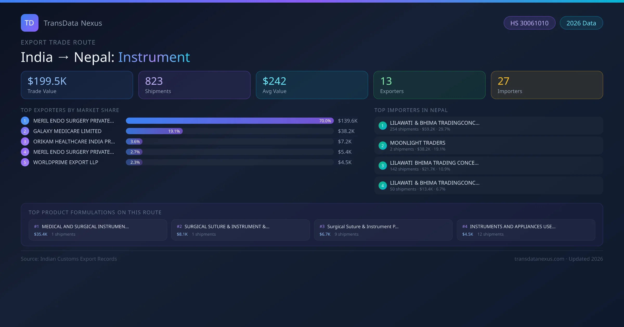 The India to Nepal Instrument corridor is one of India's established pharmaceutical export routes, with 823 shipments documented worth a combined $199.5K USD. The route is dominated by MERIL ENDO SURGERY PRIVATE LIMITED, which alone accounts for roughly 70% of all export value, reflecting the consolidated nature of India's instrument manufacturing sector.