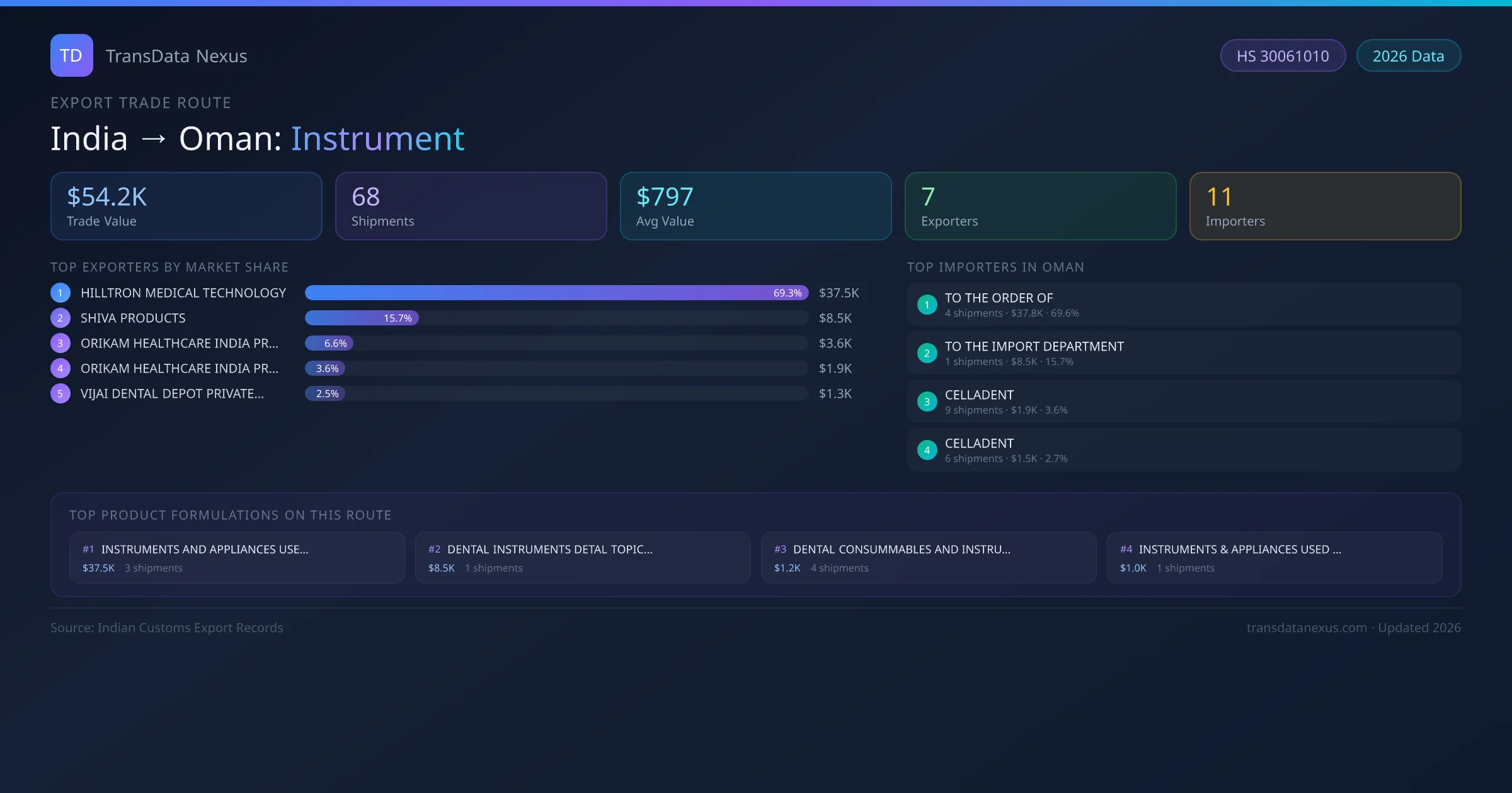 The India to Oman Instrument corridor is one of India's established pharmaceutical export routes, with 68 shipments documented worth a combined $54.2K USD. The route is dominated by HILLTRON MEDICAL TECHNOLOGY, which alone accounts for roughly 69% of all export value, reflecting the consolidated nature of India's instrument manufacturing sector.