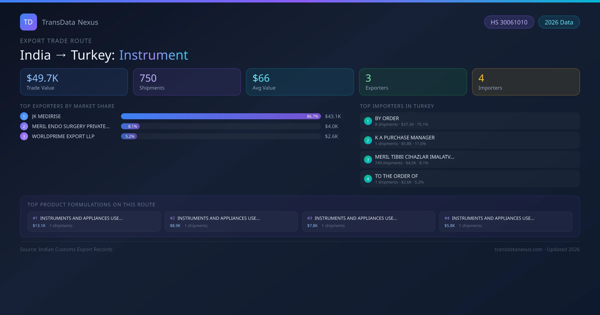 India has recorded 750 verified shipments of Instrument exported to Turkey, representing a combined trade value of $49.7K USD. This corridor is served by 3 active Indian exporters, with an average shipment value of $66 USD. The leading Indian exporter is JK MEDIRISE, which accounts for 87% of total export value with 9 shipments worth $43.1K USD. On the buying side, BY ORDER is the largest importer in Turkey with $37.3K USD in purchases. The top 3 suppliers — JK MEDIRISE, MERIL ENDO SURGERY PRIVATE LIMITED, WORLDPRIME EXPORT LLP — together control 100% of total trade value on this route. All data sourced from Indian Customs (DGFT) shipping bill records. Values reported in FOB USD.